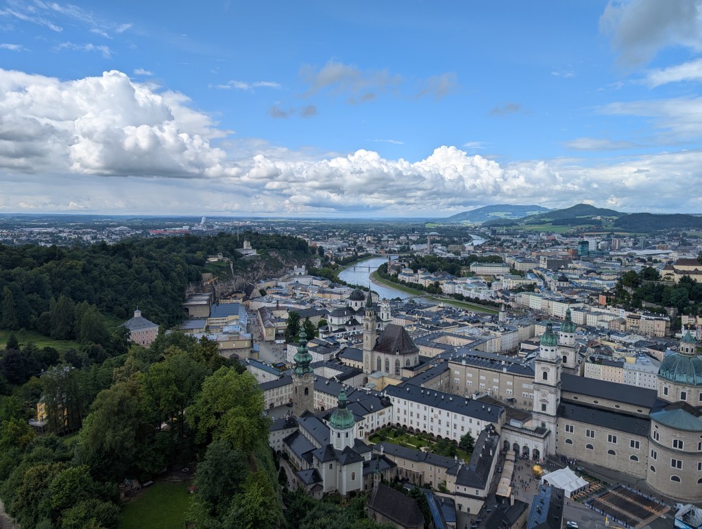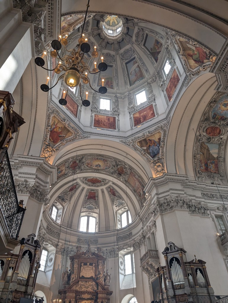 Sundays in Europe mean that most stops and restaurants (outside of tourist ones) are closed and people spend their mornings at church. The Dom Salzburg, built in 1628 in the same location as two medieval churches which both burned down, is one of the first early baroque churches in the area, is at the center of Salzburg’s Old City, so despite not being religious or knowing German, I decided to spend my morning at the 10 am high mass. The grand space was filled with visitors avidly listening to the sermon and readings, which I tried my best to follow along with. However, the highlight of the mass is the music. The musicians are perched in the back of the church above the congregation. The church boasts an impressive seven organs which create a deep music backdrop to the stunning choir voices. I listened to the beautiful music while scanning the marble details of the arches and domed ceiling.