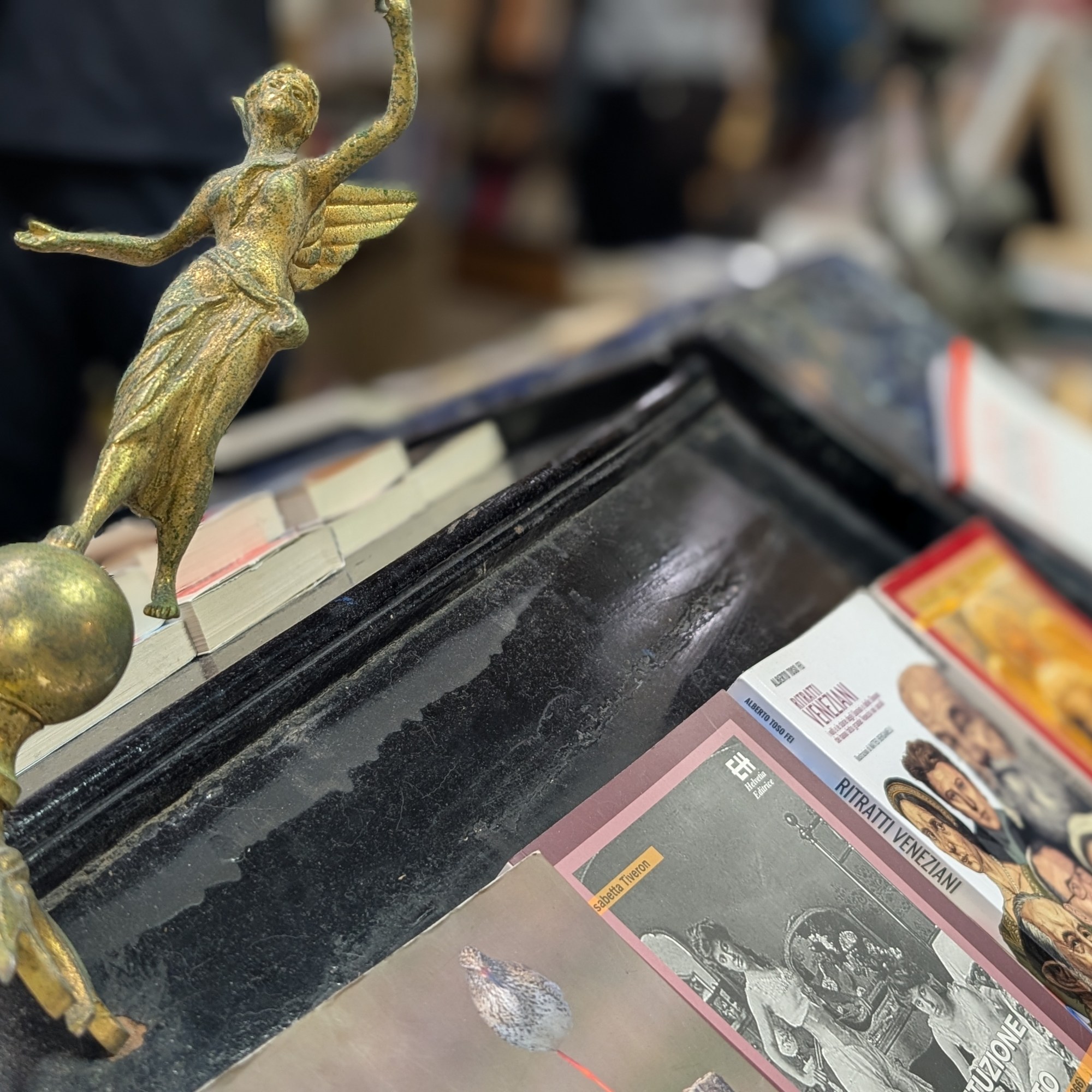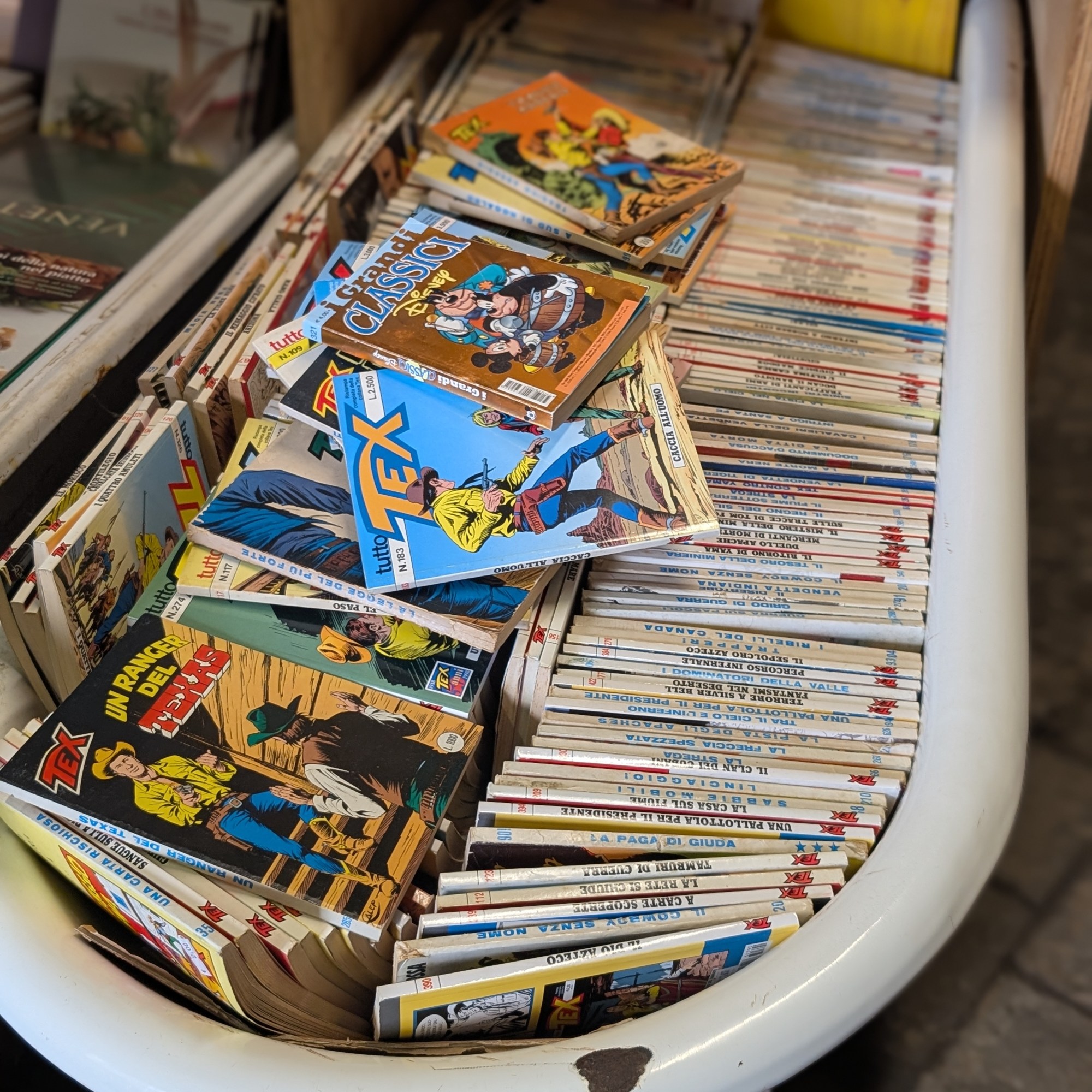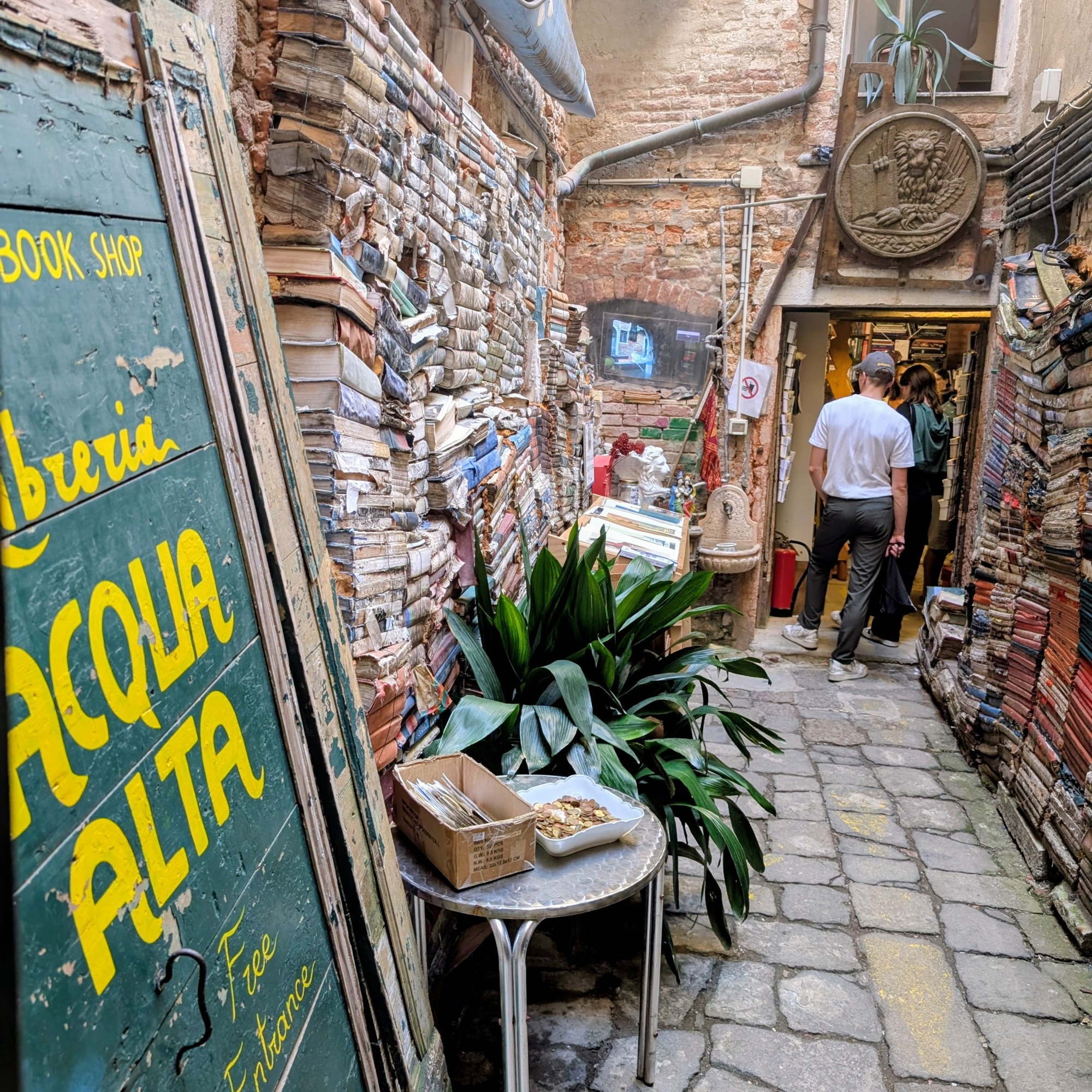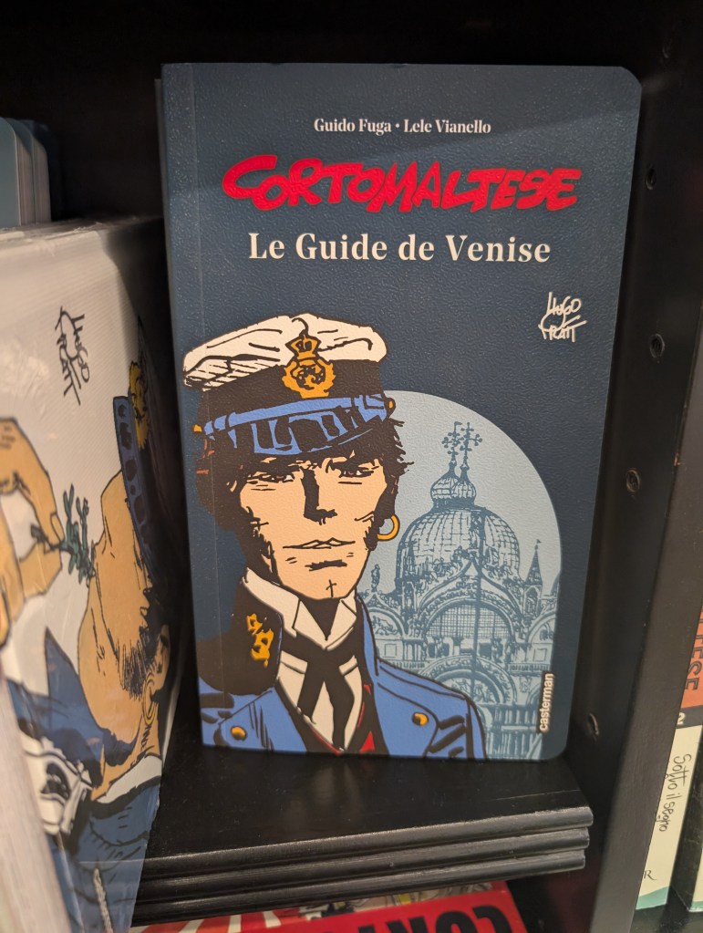 Almost every time I pass a bookstore, I go in. I like to see what authors or genres bookstores feature, how they lay out their space, and read any employee recommendations that might be on offer. In Europe, I know that most of the books will be in a different language, but that doesn’t stop me from being drawn in. On my first night in Venice, I ate at this small restaurant that had an unusual poster on the ceiling. When I asked the owner about it, he wasn’t able to fully explain it to me, but when I saw this same face plastered across a whole counter of books in one bookstore, I knew there was some cultural significance to this character. I learned from the bookstore owner that it is the cult graphic novel character Corto Maltese, known for his Ulysses style adventures featuring mystical elements in places like the South Pacific and Venice.