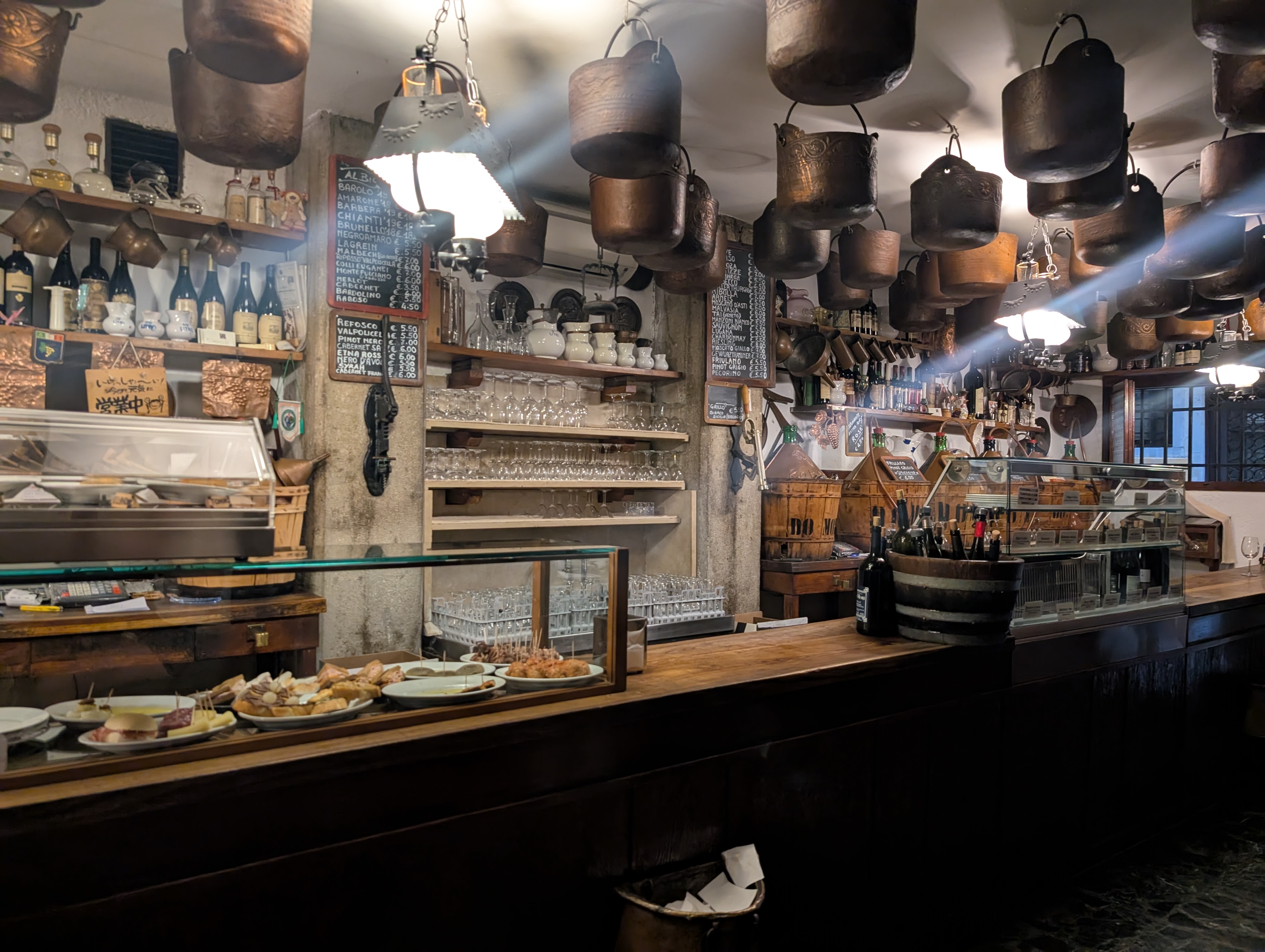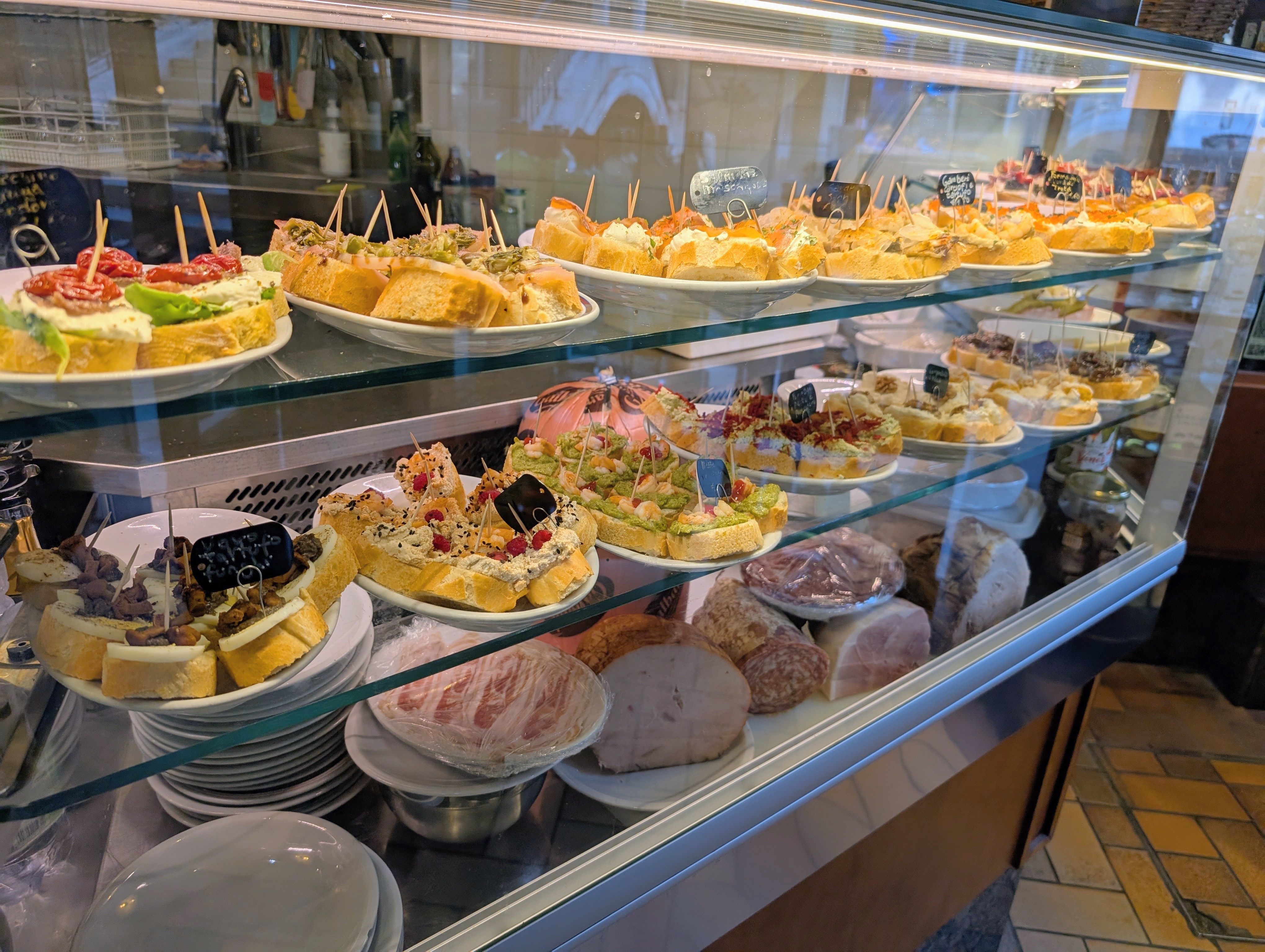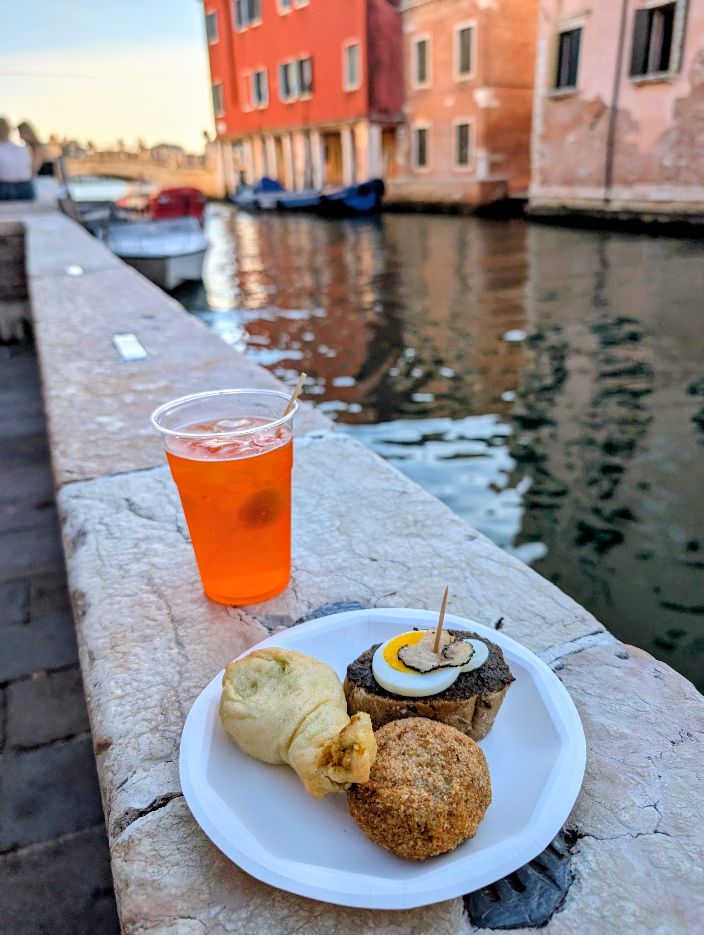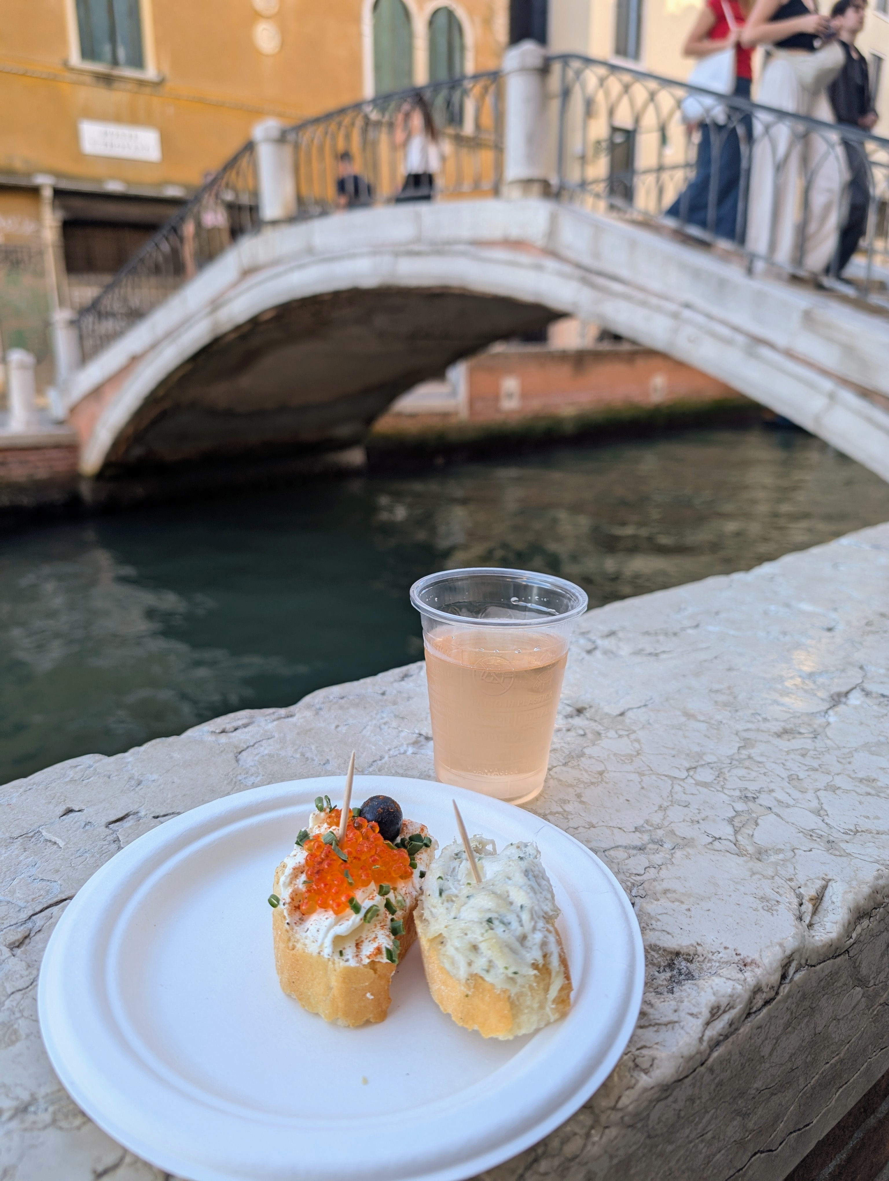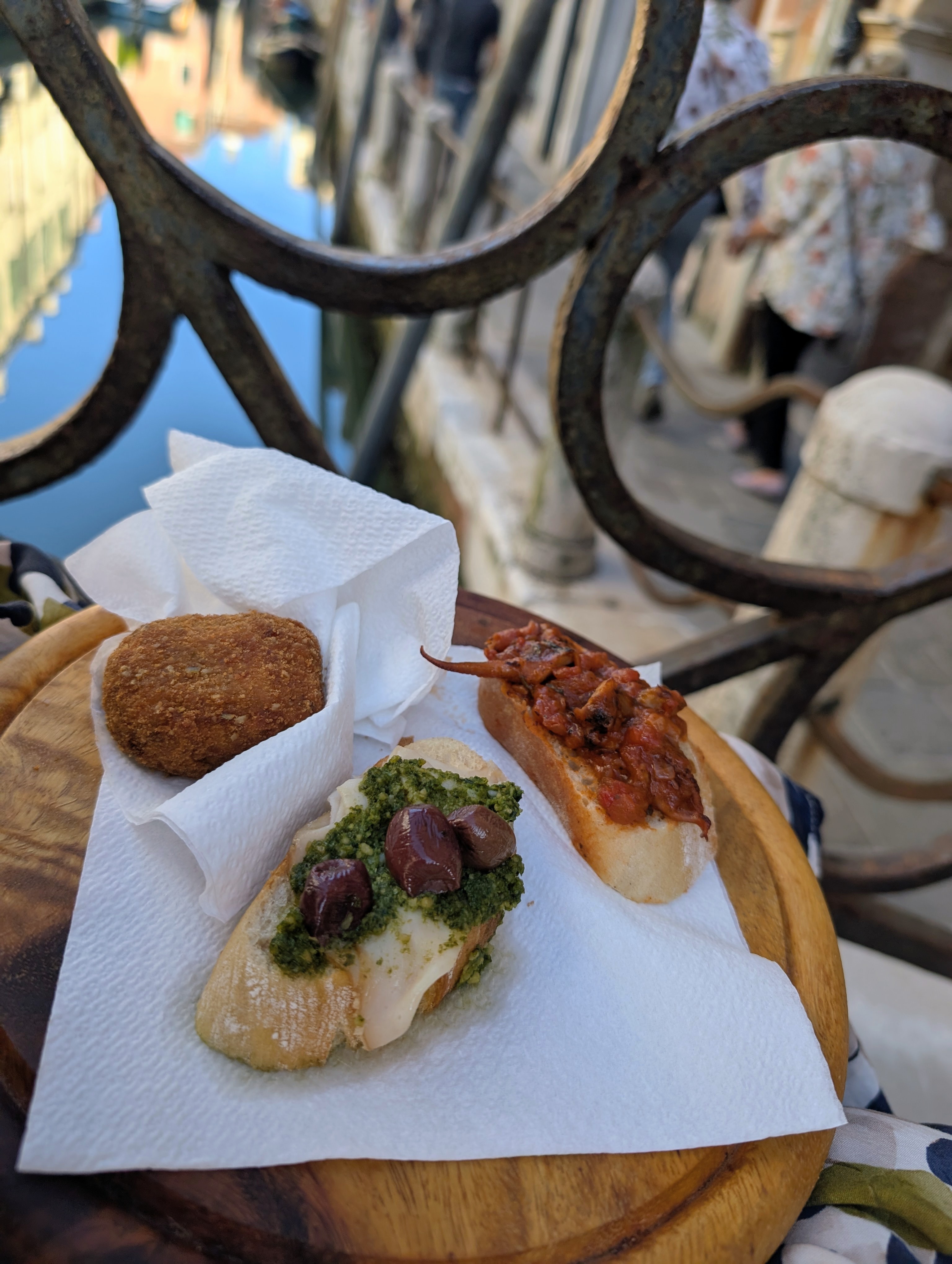 I’m not great at picking out good food for myself. I get too overwhelmed with a menu because I want to try local favorites but also don’t want to commit to something that I’m not sure I will like. When I found my first osteria serving cicchetti, I finally found a way to sample local flavors without reservation. Laid out behind glass (so people can see what things look like), most osterias/bacari serve over ten different types of cicchetti. These tend to be crostinis with toppings, polpettes (fried balls of different ingredients), marinated fish and olives, and meats and cheeses. Local delicacies like anchovies, truffles, eggplant, octopus, and cod are featured along with classic Italian cheeses and meats. One night I moved from one osteria to the next sampling a few cicchetti with a drink until I felt like I didn’t need to eat dinner – locals call this a “giro d’ombra”. This was my favorite night. It not only allowed me to taste the city, but I got to experience the different vibes of neighborhoods – whether it was the cozy wood paneled corner barcaro, palazzo patio, canal-side barcaro with people spreading out on stairs and walls, or the one where protecting your food from the seagulls is part of the experience. And yes, I did see seagulls steal multiple people’s bites.