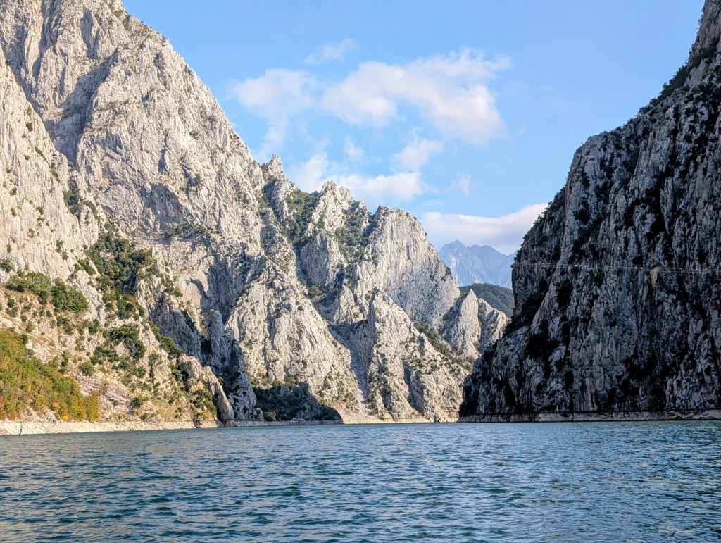 The people working the boats and cafe made sure to take care of all of us before we headed off on our trip. We boarded a long narrow boat that can hold about 25 passengers to navigate the lake. At its narrowest, Lake Komani is only 50 meters wide and stretches to only 400 meters at its widest, so it feels more like a river than a lake. Mountains rose up on either side of the river, and I could easily see how much lower the water is compared to its normal water line.