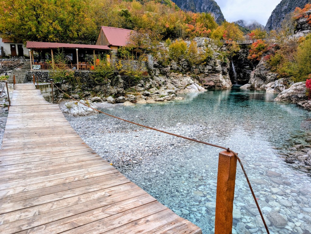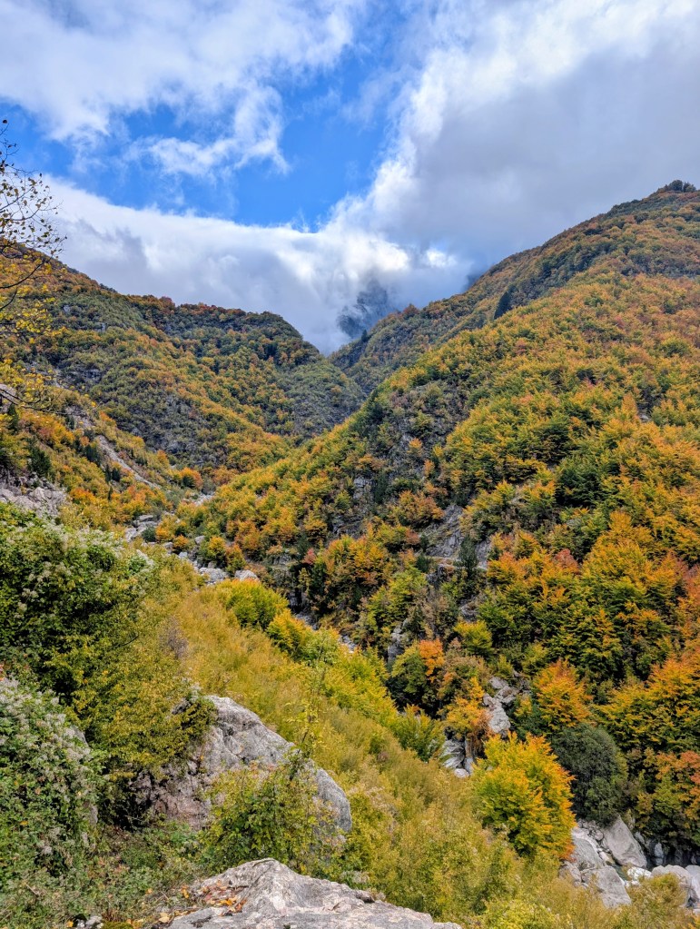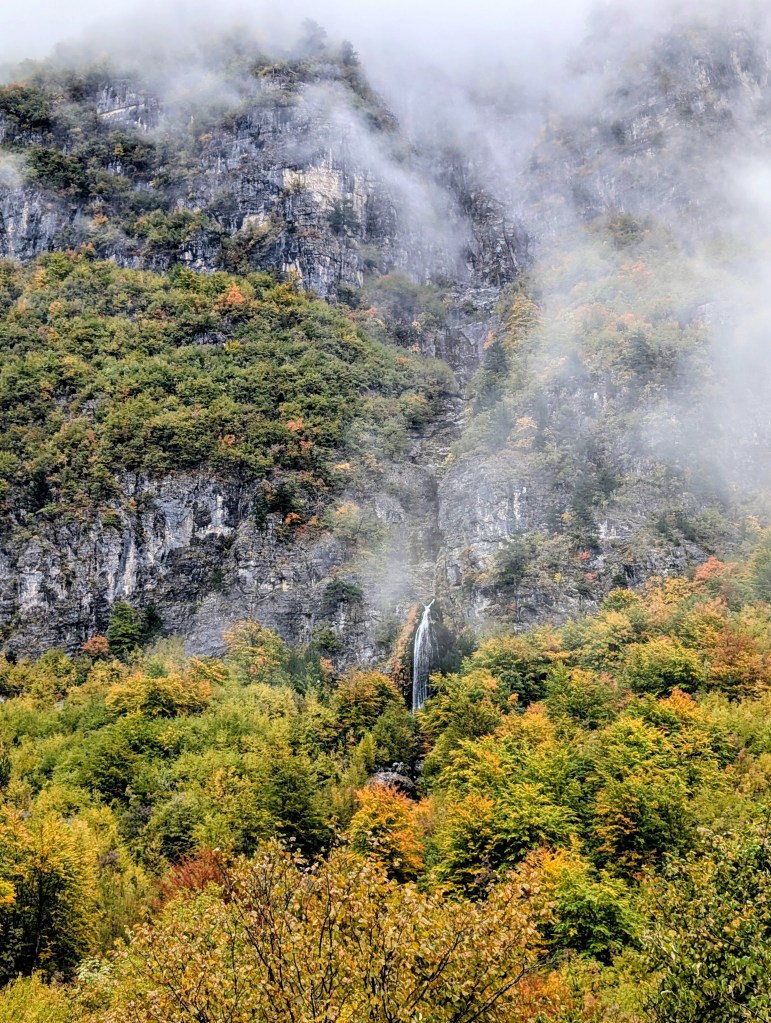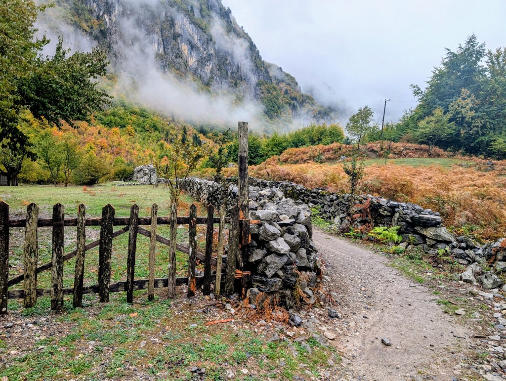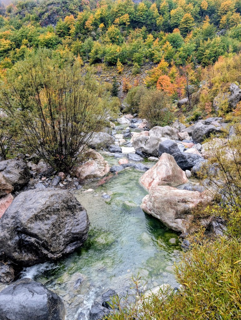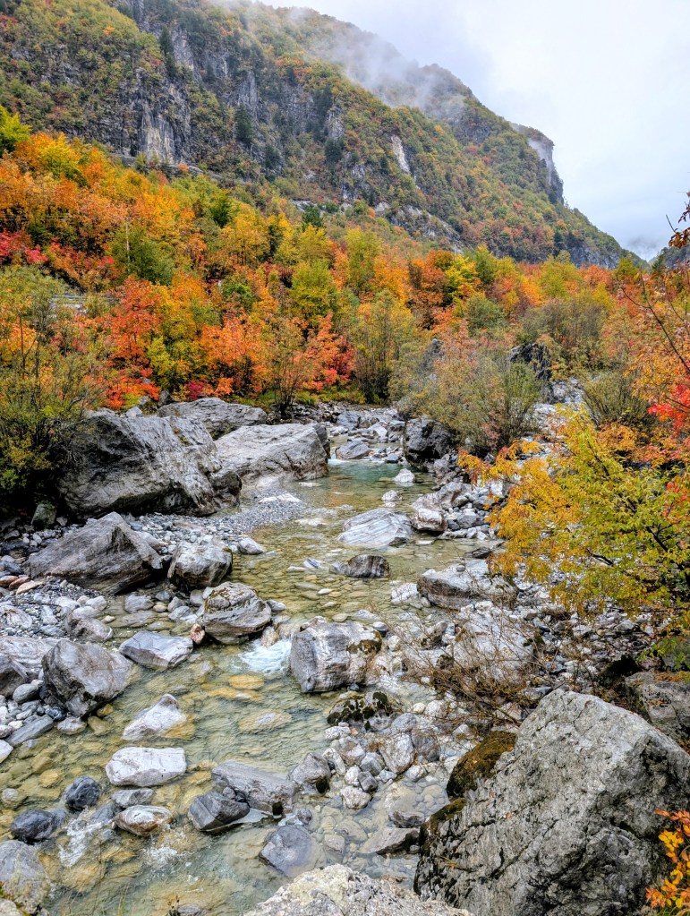 As I hiked, I feasted on the views of the valley, neon reds and yellows of fall foliage, mountains peaking through the clouds, and gray blue water of the river. After about 3.5 miles, I reached the small village of Ndërlysaj. My dog was still with me, so I was hoping to find a market to buy him some food, but outside of a few cafes that were closed for the season, there wasn’t much in the village. I did find a small kiosk selling coffee and ran into a few other hikers from my guest house, so I joined them and their two dogs (who also followed them from Theth) for the rest of the hike.