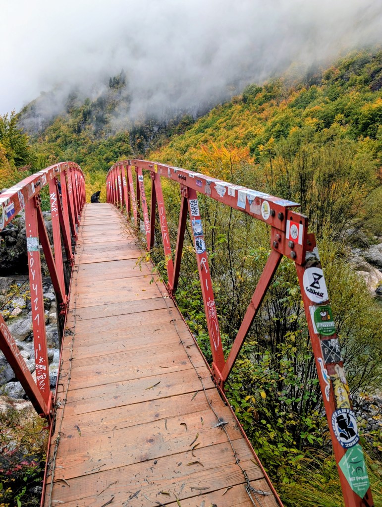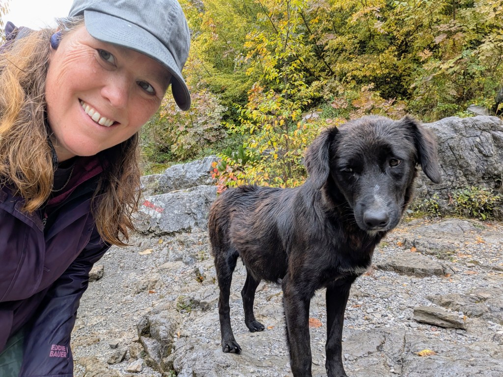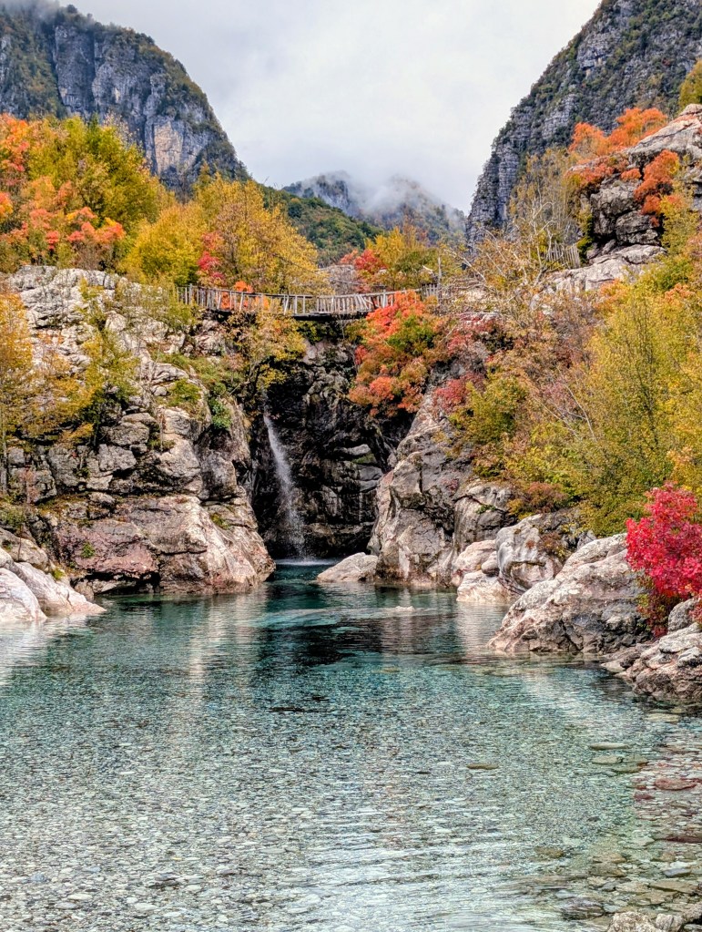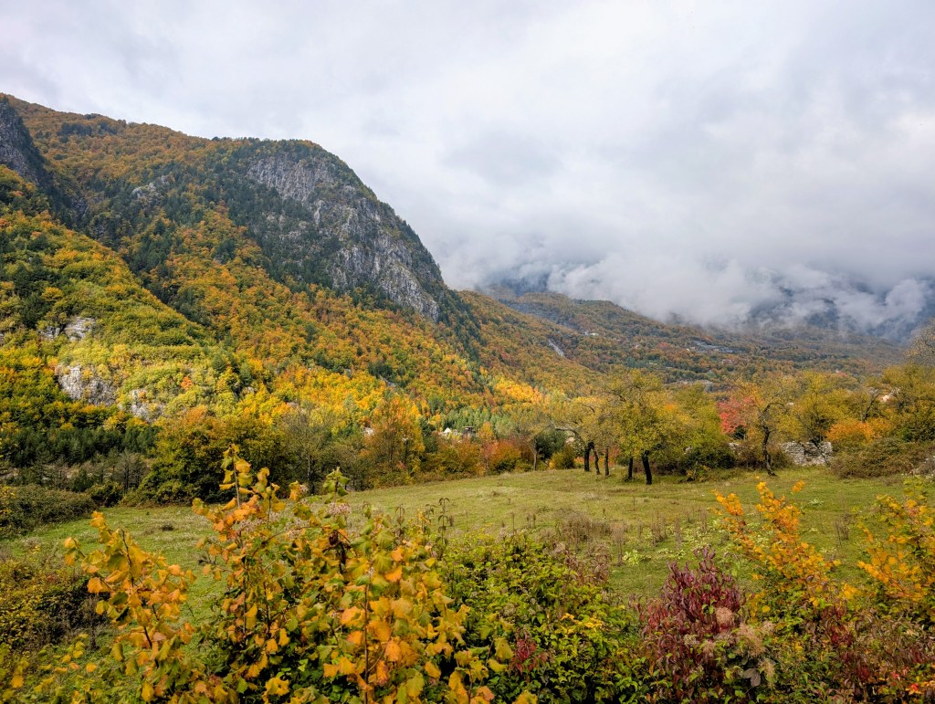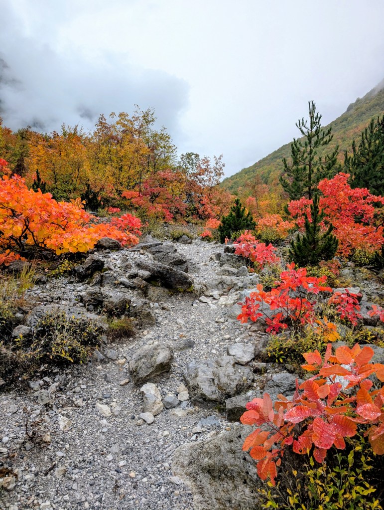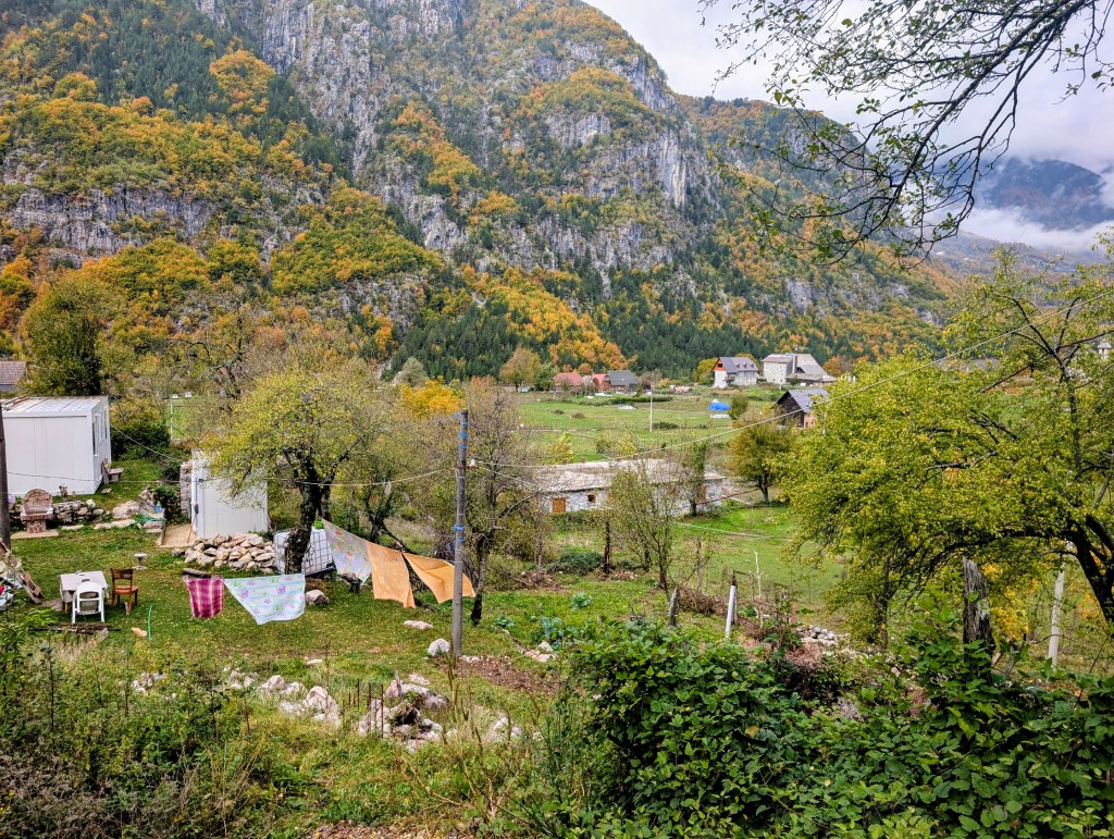 As I hiked, I feasted on the views of the valley, neon reds and yellows of fall foliage, mountains peaking through the clouds, and gray blue water of the river. After about 3.5 miles, I reached the small village of Ndërlysaj. My dog was still with me, so I was hoping to find a market to buy him some food, but outside of a few cafes that were closed for the season, there wasn’t much in the village. I did find a small kiosk selling coffee and ran into a few other hikers from my guest house, so I joined them and their two dogs (who also followed them from Theth) for the rest of the hike.