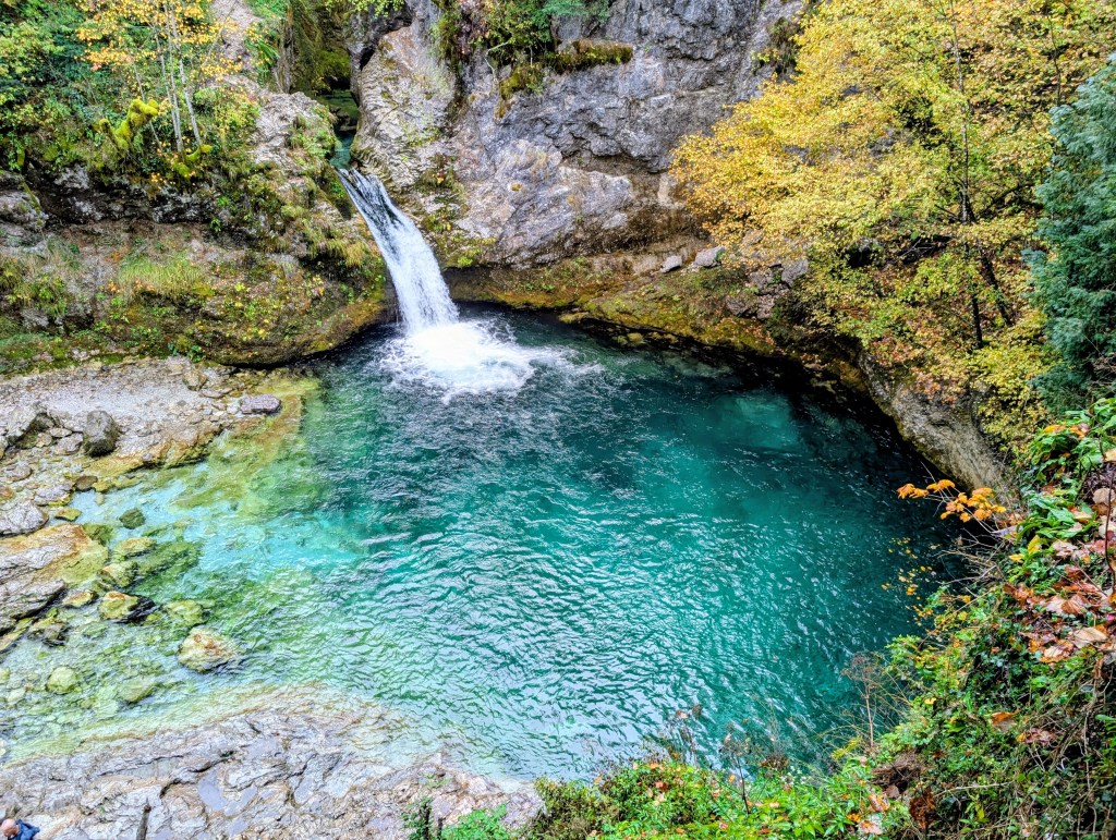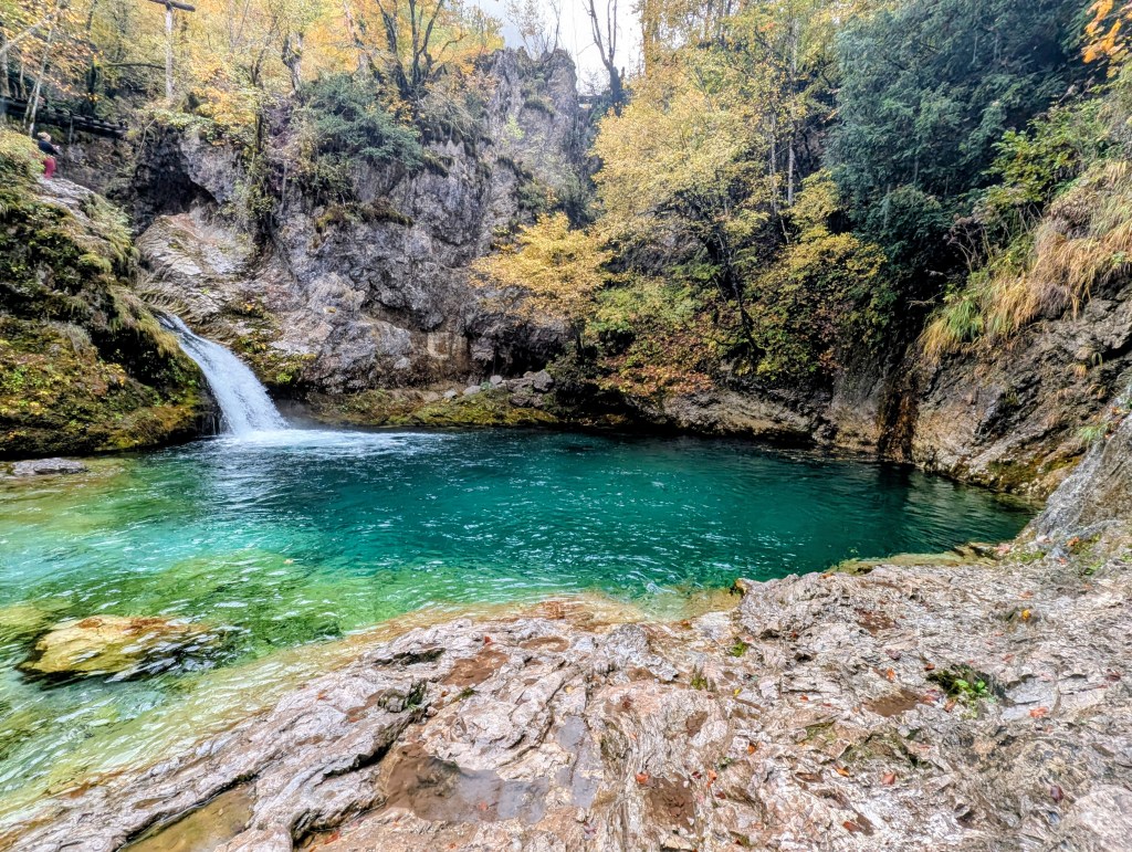 The hike from Theth to the Blue Eye follows the Theth River through the valley. The trail is fairly easy with a slight elevation drop, but there are some rocky spots that, especially with the rain, needed some more careful navigation. While I joined two people from my guest house for part of the hike, they decided to take the Grunas waterfall detour so I was on my own again. I knew the hike to the Blue Eye was going to be long, so I didn’t want to expend too much energy with the steep hike to the waterfall. I was hoping to come back and complete it the next morning, but I ended up not having the time to do so. However, the waterfall is visible from the main trail, so I got to see a little glimmer of it.