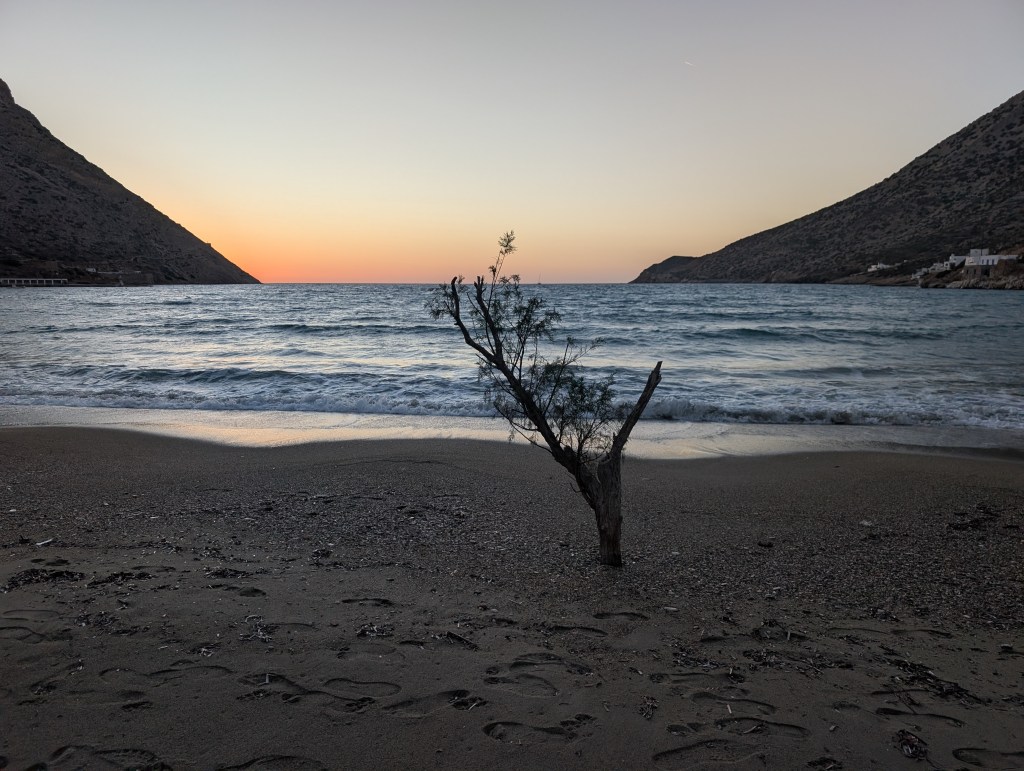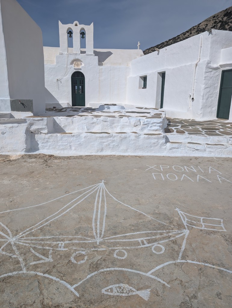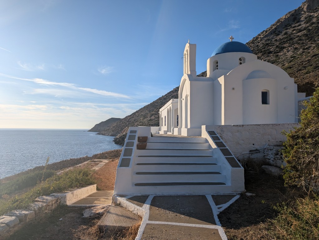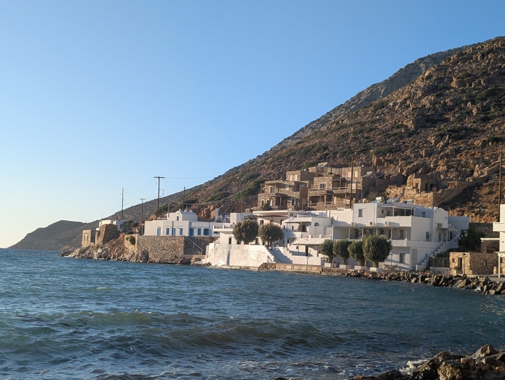 The other late afternoon I enjoyed the short walk out to St. Catherine’s church for views of Kamares harbor and the evening sun. Because of the mountain, Kamares bay loses the sun early on, but when I found it still shining at St. Catherine’s I took advantage of the deep pool of water for a sunset swim before walking back.