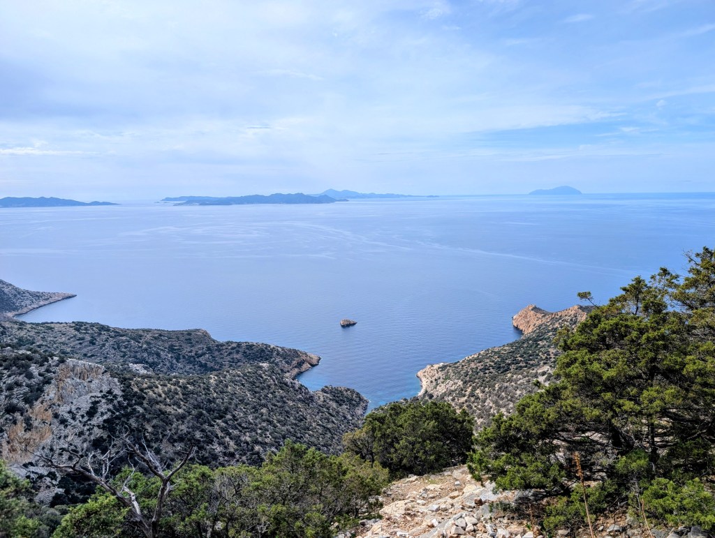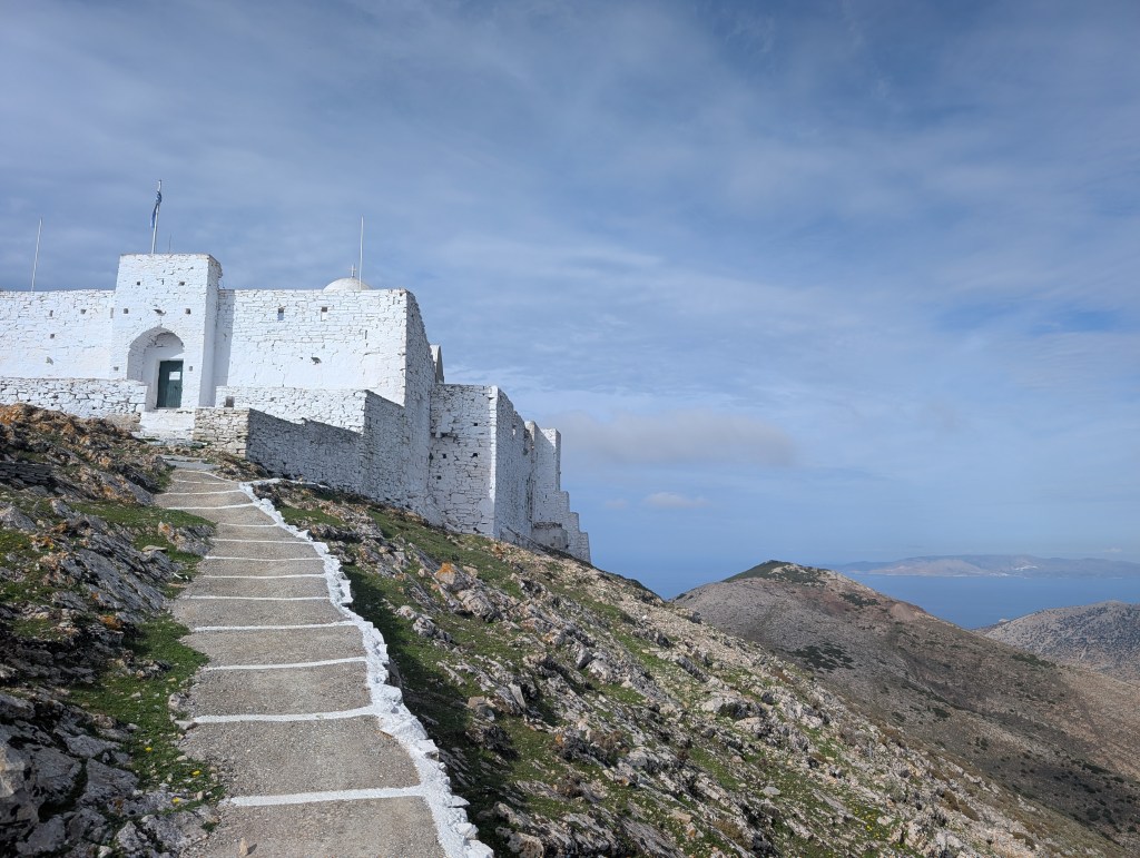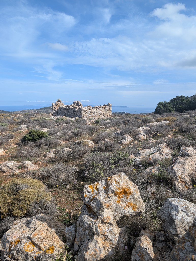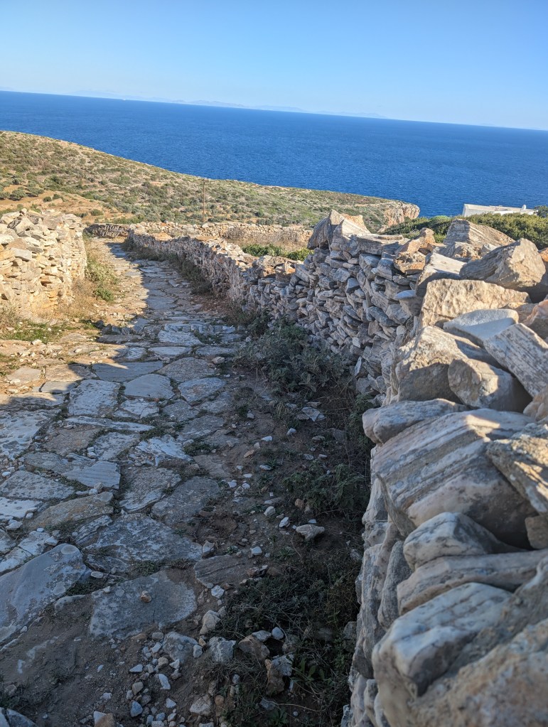 From here, the walk moved into nature with farmland, rolling fields, and views of the sea. The path took me to the coast where I walked with a clear view of my next destination, the medieval hill town of Kastro, in my sights