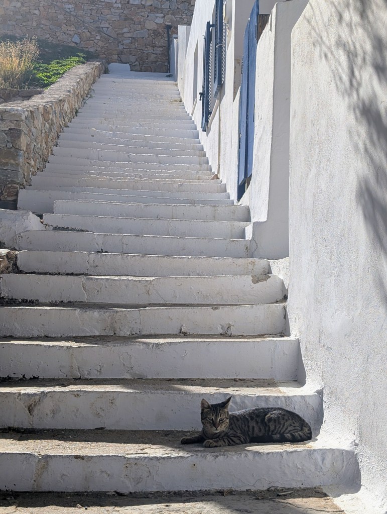 Arriving early in the morning in Apollonia meant that the shops were closed and the alleys were empty of tourists; however, the local cats were out and looking for attention and the local people were getting ready to start their work for the day. The gradual steps through the town showcased the classic Cycladic white stone architecture adorned with Sifnos clay pottery.