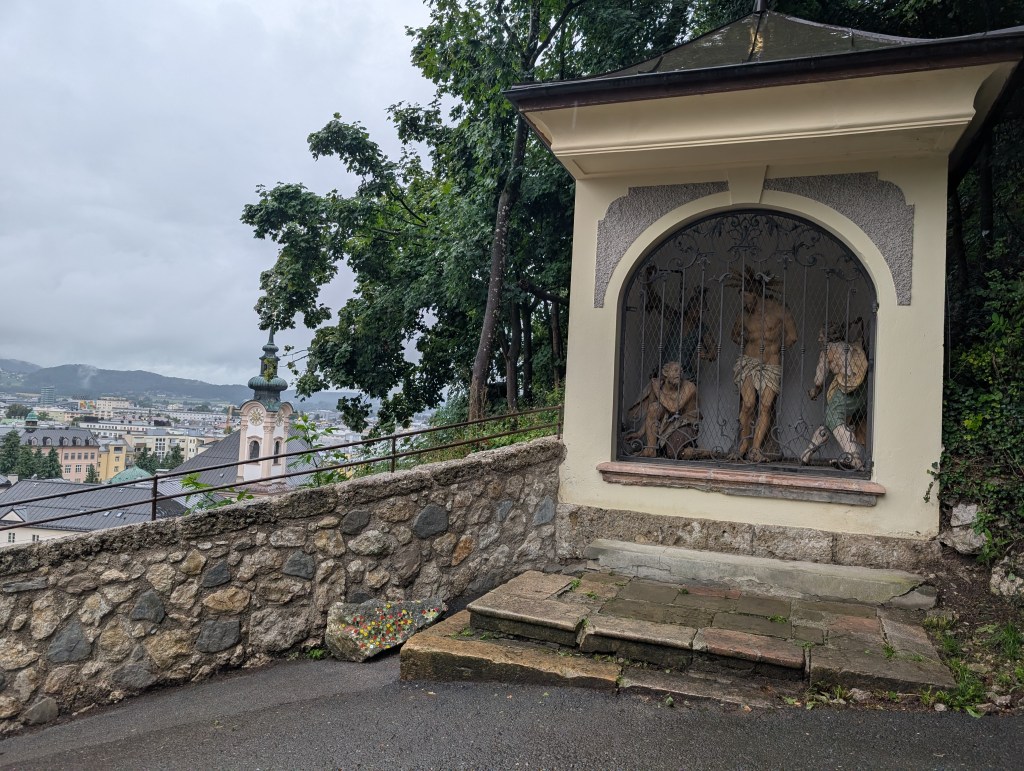 Just off Linzer Gasse, the pedestrian street that leads down the hill to the Salzach River, is the entrance to Felixpforte’s steep historic pilgrimage path up to the Capuchin Monastery. Along the way are six baroque chapels, created by local artists in the mid 1700s, depicting the stations of the cross. It was a rainy afternoon, so I was happy that along the edge of the street was a set of stone steps that provided the necessary grip from the slippery stones.