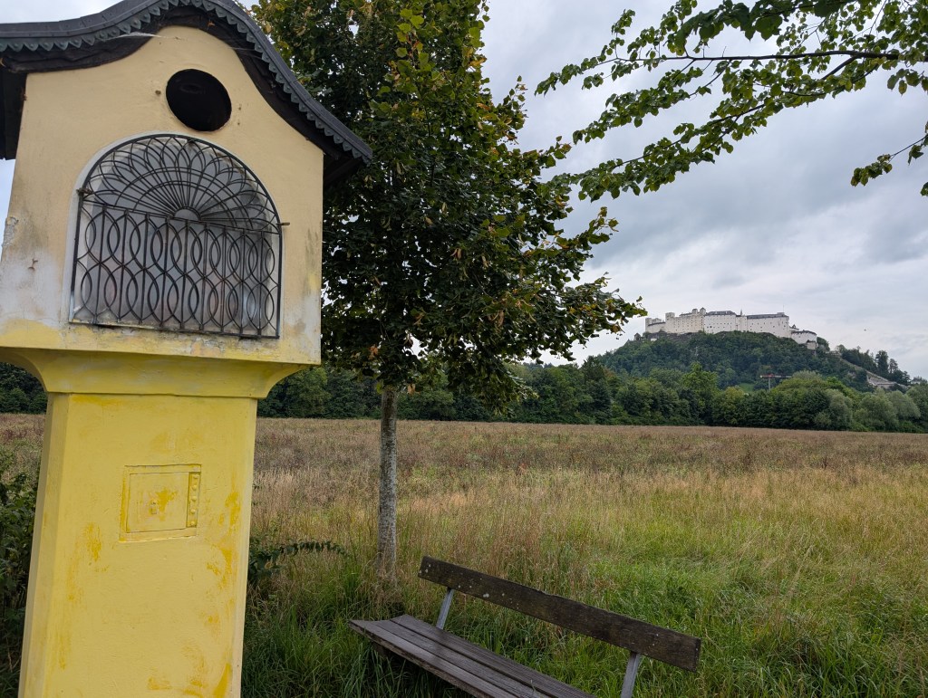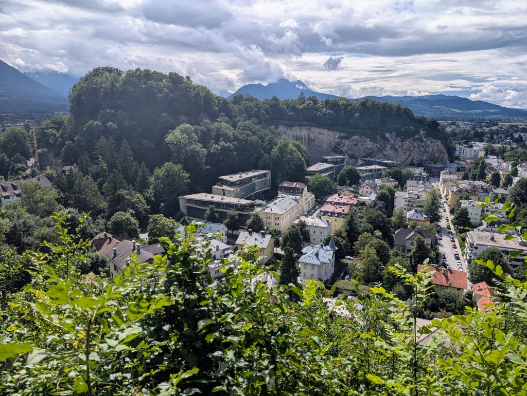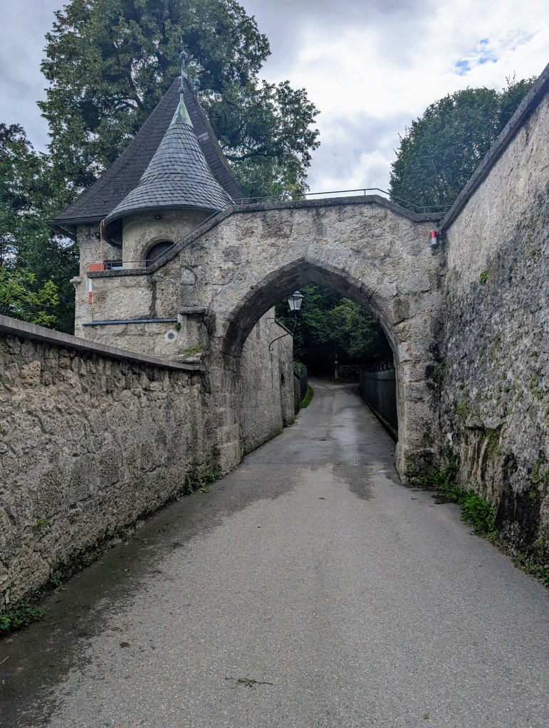 The next day I spent the morning at the Hohensalzburg Fortress. After exploring the interior of the fortress and its musuems, I decided to walk around the Festungsberg (Fortress Mountain) for more views of the city. I followed the Doktor-Ludwig-Prähauser-Weg (named after local teacher and writer) over the ridge of the mountain. The first lookout area, Richterhöhe, was up a small hill after a water fountain (always fun to fill up my water bottle with one of these). It offered its own historic walls and tower but more importantly provided a panoramic view of the fortress with my first look at the Swiss Alps in the distance – I would be heading there in a few days.