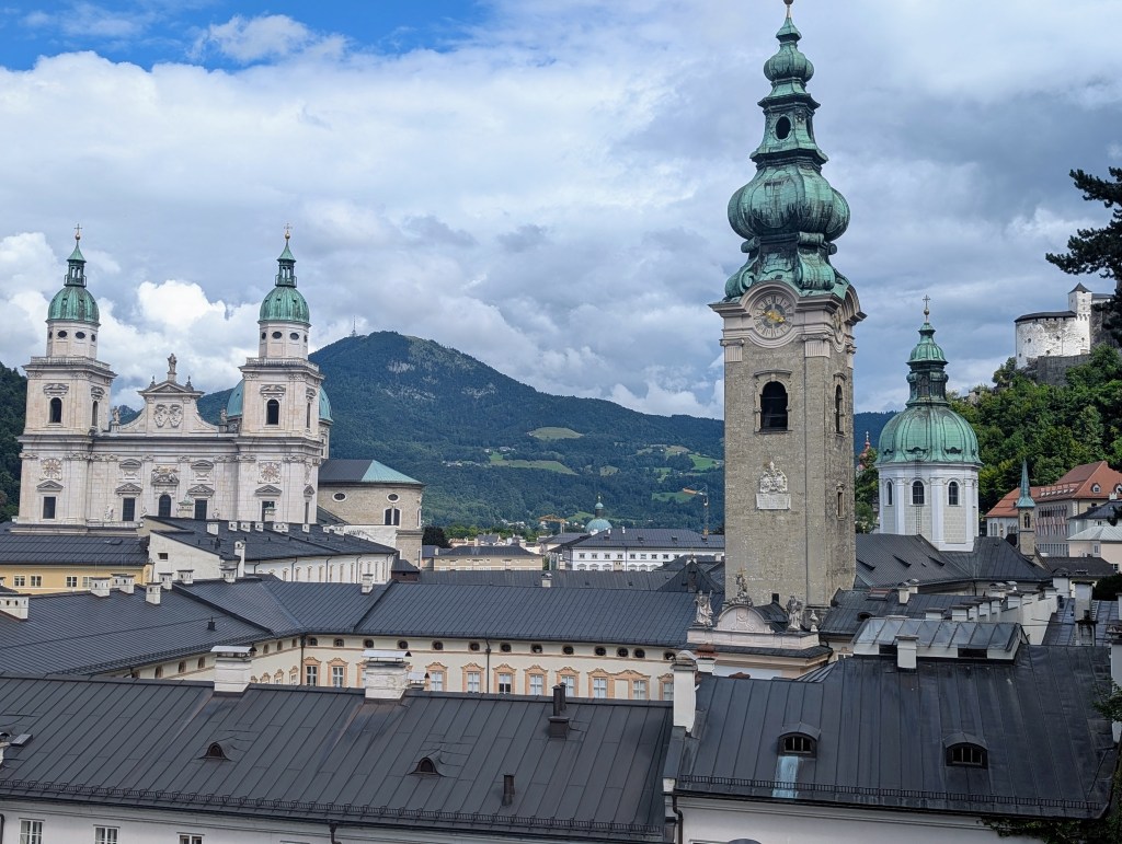 While the path continues and ends at the Modern Art Museum, I didn’t have time to finish it; instead, I turned around and headed back to the old city via the steep, but picturesque, Mönchsbergviertel. As I carefully walked down the slippery path (it rained off and on during my whole time in Salzburg), I made sure to pause to take in the more intimate views of the historic architecture within the city. It’s rare to be this high and close to the upper parts of buildings; this vantage point allows you to see details that you wouldn’t be able to see from below.