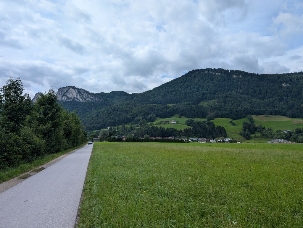 On my last day in the city, my train didn’t leave until early afternoon, so I was able to spend the morning venturing outside the city center. I’ve heard that Salzburg is known for biking, and while there were a fair amount of bike shops around, there were surprisingly only two bike rental options – and neither were open on weekends. Luckily, I was leaving on a Monday, so I rented an ebike to ride along the Salzach River to the small town of Hallein. It was obvious from the hour long ride to the town that Austria has a robust biking culture as I saw both long distance bikers with their overloaded packs attached to their bikes as well as local bike commuters. Sadly for all of us, we got caught in some downpours for much of the ride. Still, it had been raining for a few days now, so I feel like we were all used to getting wet at this point.