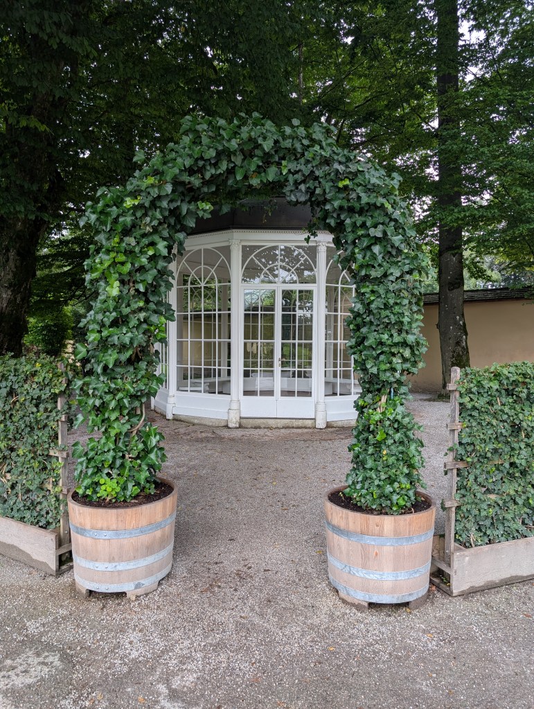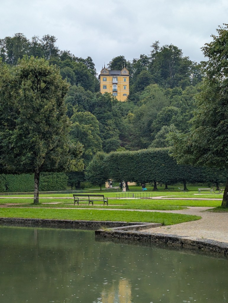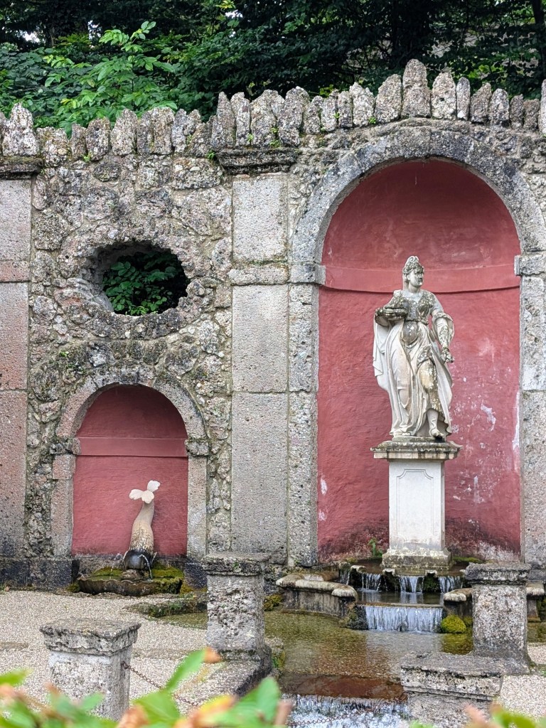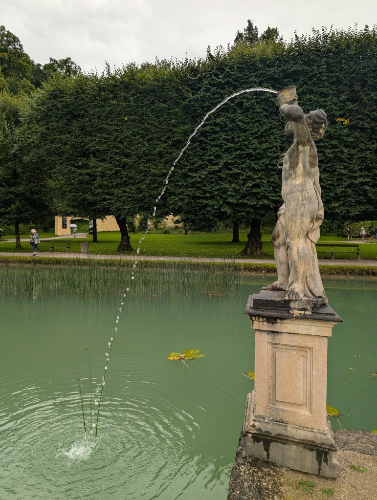 On the way back, I took the detour to see Hellbrunn Gardens. Here is one of the Sound of Music locations: the small gazebo where Liesl von Trapp sings “16 going on 17”. While the gazebo was just a gazebo to me, I enjoyed the other elements of the gardens: expansive green spaces against the hillside beyond, a magnificent fountain framing the palace, the massive trout and sturgeon swimming in the ponds, and the 17th century trick fountain displays.
