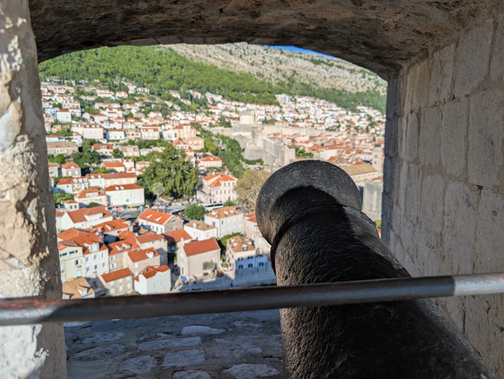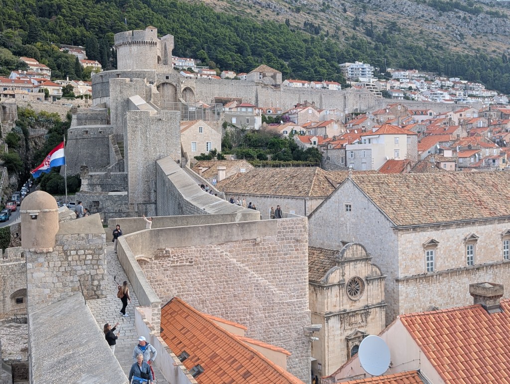 I started my morning walking the 2 km and 1080 stairs of the 13th century Dubrovnik Walls – I entered near the Ploce Gate. It took about 90 minutes to walk around, up, and down the towers, bastions, fortifications, turrets, drawbridges, and turrets set within the wall. Along the way I enjoyed views of Mount Srđ, Lovrjenac Fortress (which I visited later in the day), Lokrum island, and the historic houses of the old city. Along the coast there is a small cafe (Caffe on the Wall) to grab a drink or snack. There is no shade so be sure to wear sun protection and bring water for the walk.