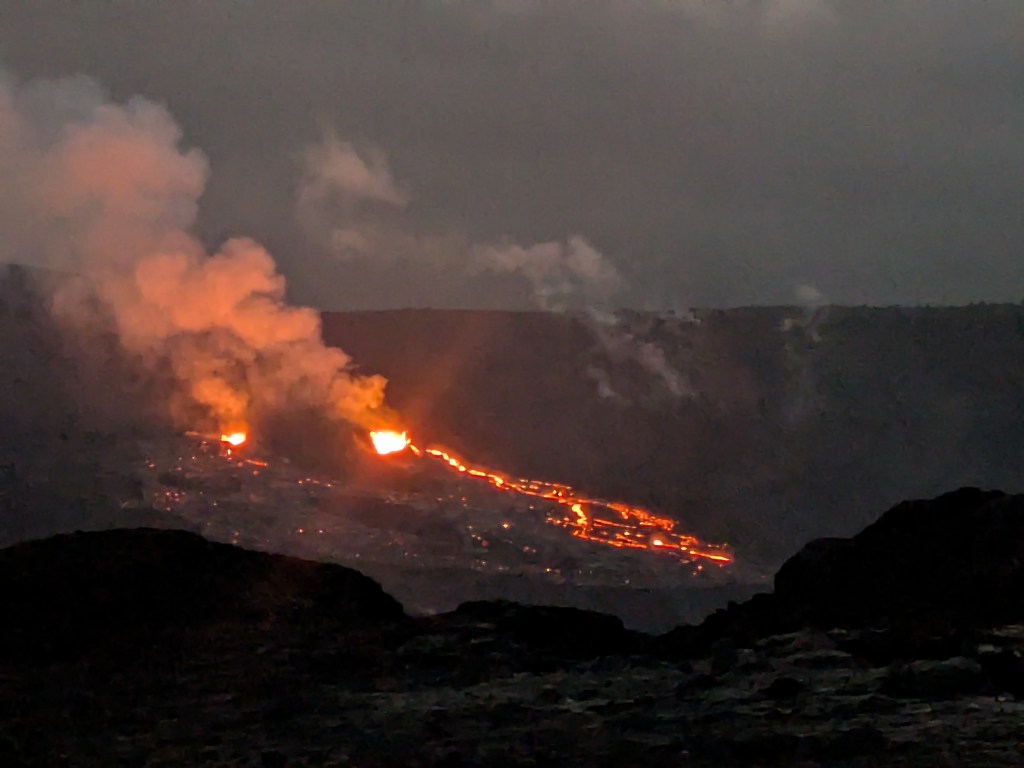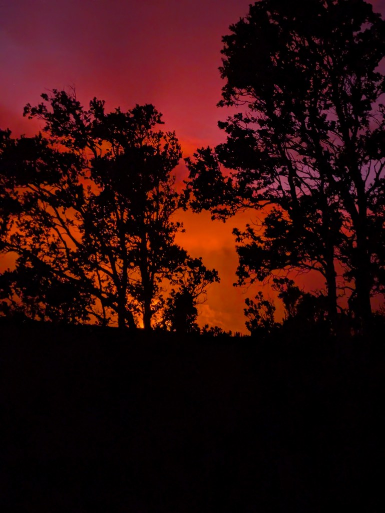 For those who don’t want to walk, the eruption is visible from several other viewpoints in the park: volcano house hotel and Kilauea Iki overlook were two places I saw it; while further away, the eruption is just as magical from these vantage points. I heard that there were also more options at the other end of Crater Rim Road, but I didn’t check them out to talk about what they look like.