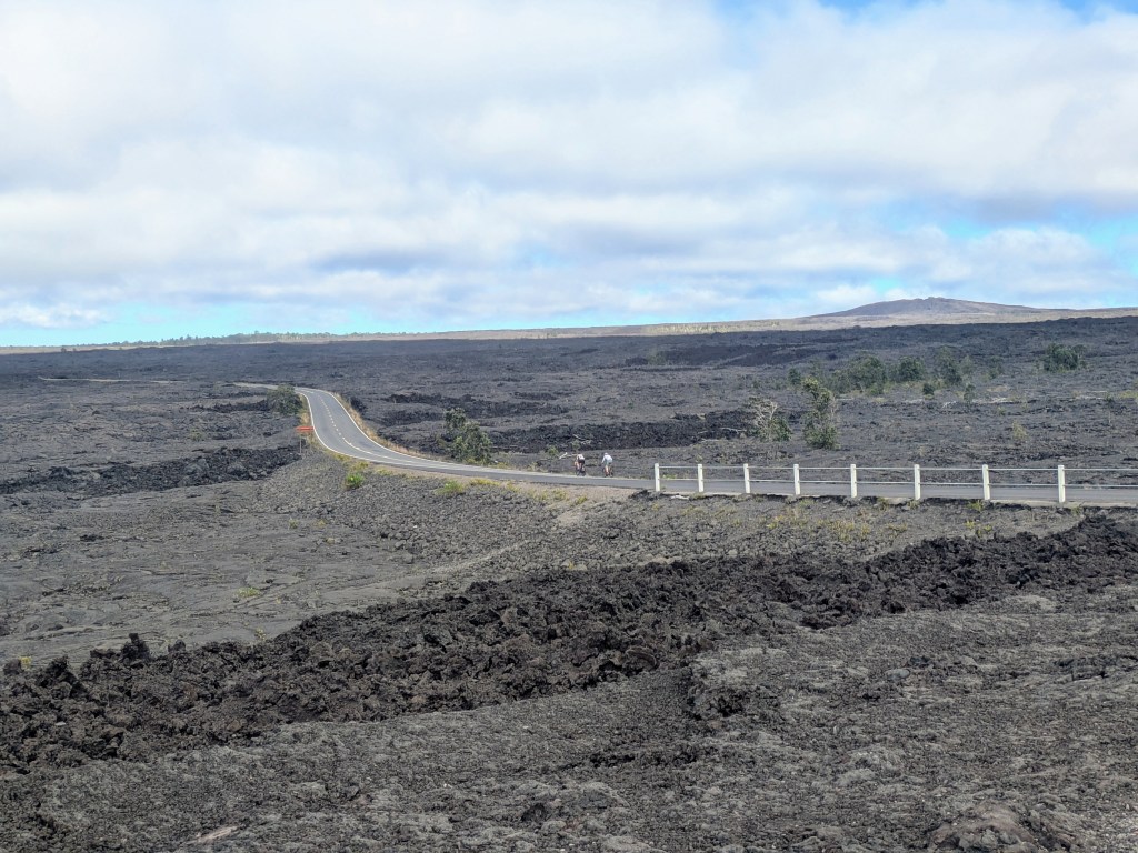 However, I also knew that at night, you don’t need an active eruption to see lava, so after quickly checking into my lodging about 5 miles away, I headed right to the park. I parked near the Devastation trail parking lot and followed the people to the 1.2 miles to the Keanakako’i Overlook. The walk to the overlook is along the old Chain of Craters road that was destroyed by the 2018 eruption. You can actually see the road leading directly to the Halemaʻumaʻu crater. From here the bubbling lava was visible from the caldera and it was mesmerizing to watch it flow and change color as it cooled. The park ranger said that he expected the volcano to fully erupt in the next 24 hrs, so from then on, I was fully on volcano watch – as was everyone else. Local restaurants have the live feed and everyone was talking about it.