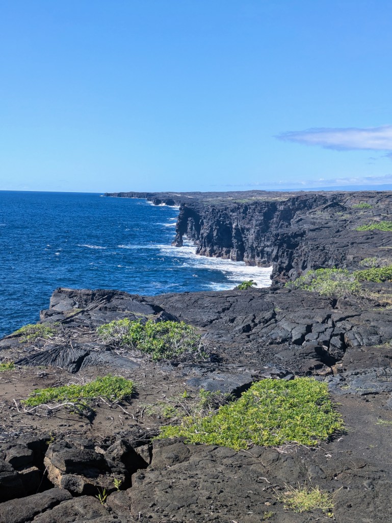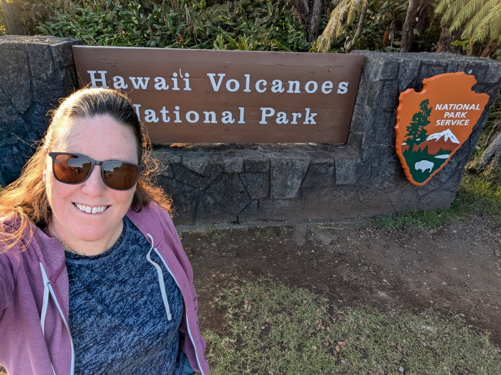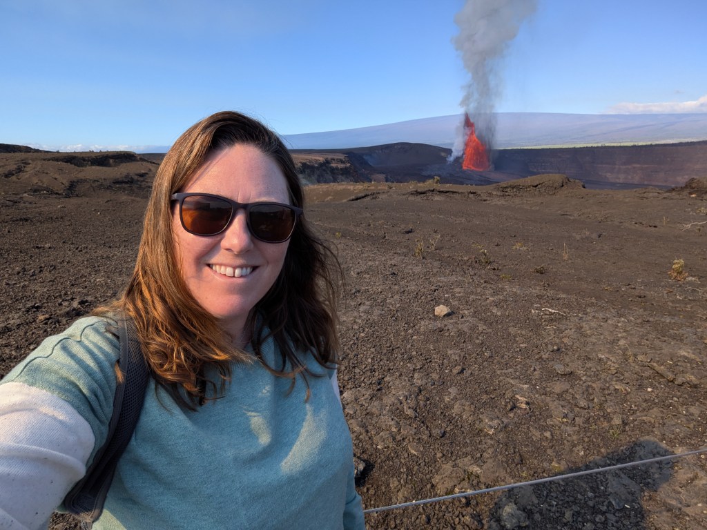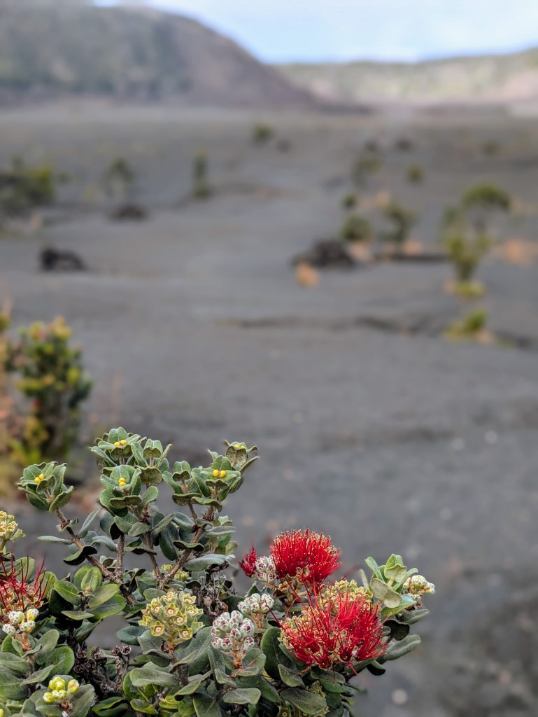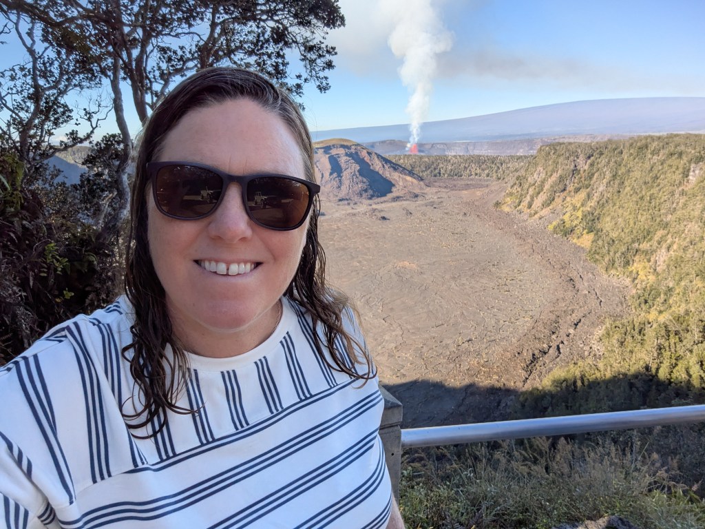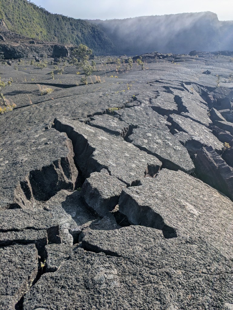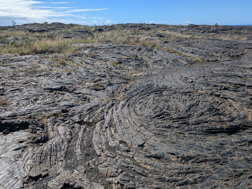 Walking on the lava lake floor was an otherworldly experience. The terrain showcased the two types of lava on the island: ʻaʻā, a jagged and rough rock and pāhoehoe, smooth and ropy. Along the way I kept seeing these fine golden threads glimmering in the sun. I tried to pick them up (which I found out later I shouldn’t have), but they were so delicate they fell apart at first touch. Talking with the park ranger later, I learned they were Pele’s hair – fine glass filaments created from lava being pulled and cooled in the air. The ranger also talked about Pele’s tears – small black glass pellets – but I didn’t notice these (or know to notice them).