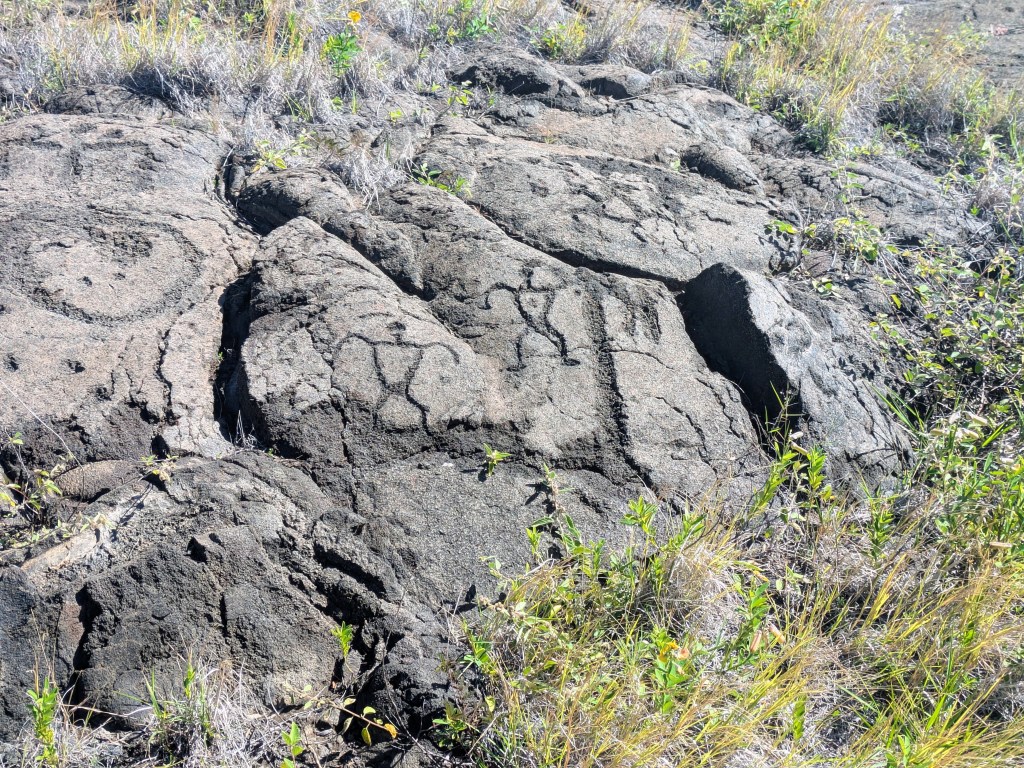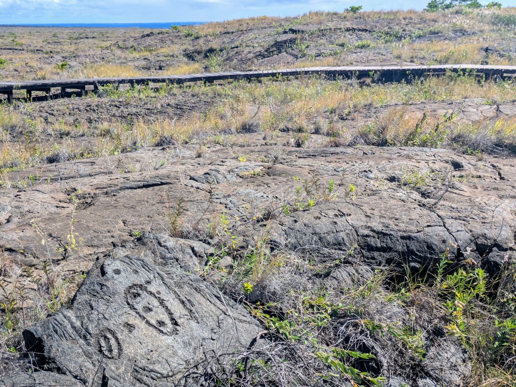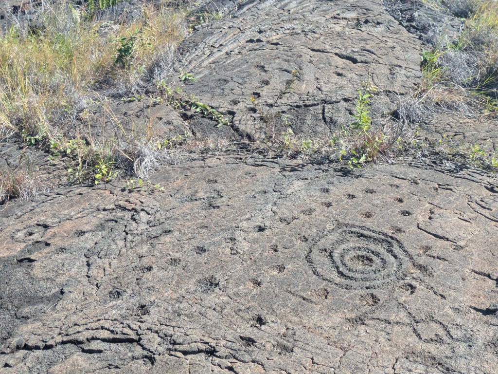On the way back, I stopped to walk the 1.4 mile round trip trail to the Pu’uloa Petroglyphs. Translated to “hill of long life”, Pu’uloa was a sacred place for ancient Kalapana Hawaiians to visit and peck holes into the hardened lava to bring longevity to their family. Each family had a different pattern in their cupules digging, so the area is covered with these designs – in total there are over 23,000 motifs.