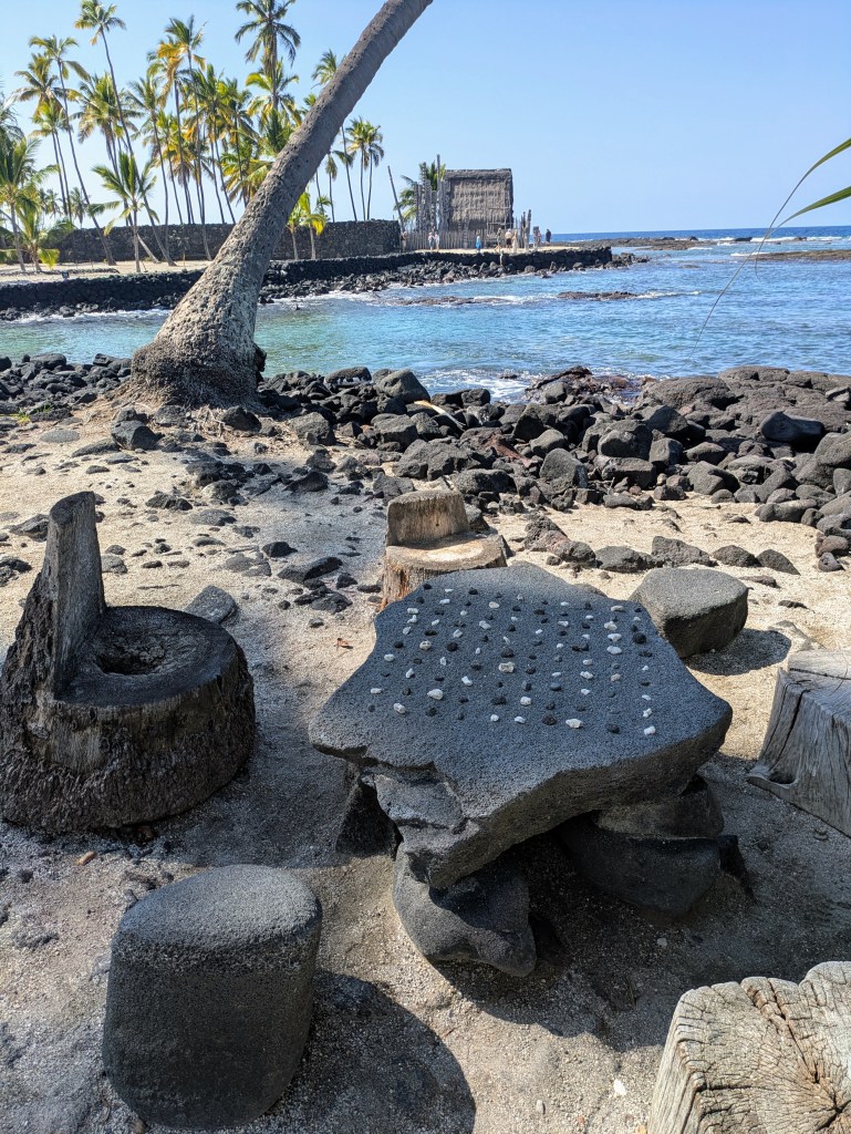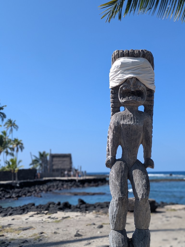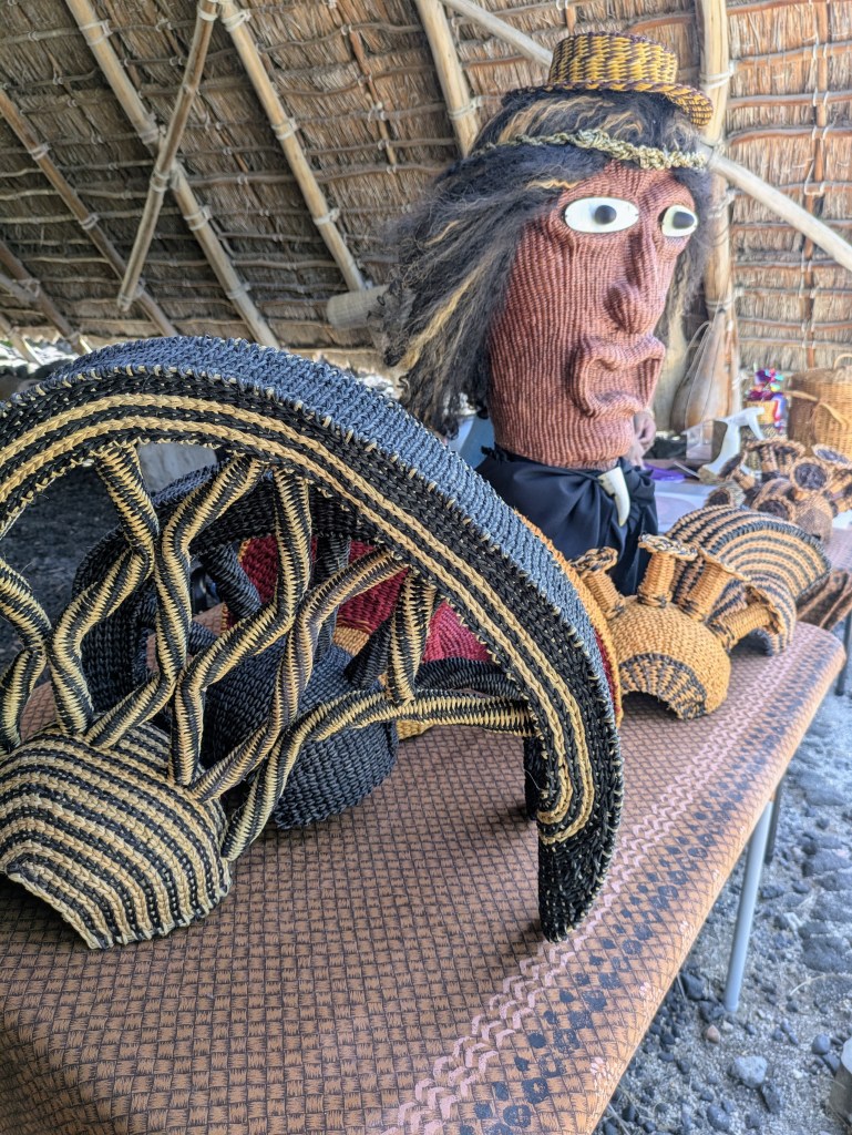 Besides offering beautiful views of the ocean and coastline, there were several cultural ambassadors there to speak about local Hawai’ian craft and history. I spoke with people who weave baskets out of coconut fronds, create helmets from ie’ie, and revive family histories through ink prints. The walk around the site brought me to totems representing the Hawaiian gods and guardians and ruins of the royal grounds.