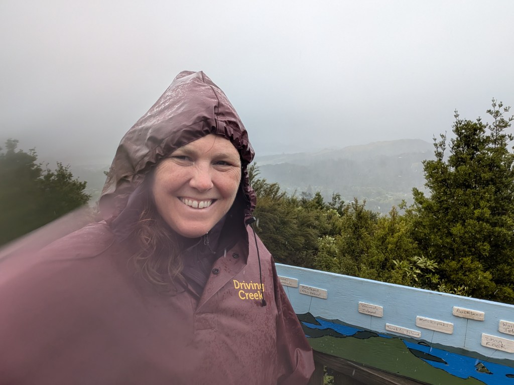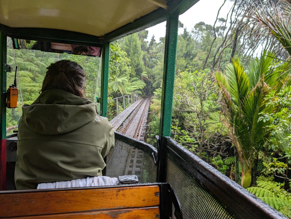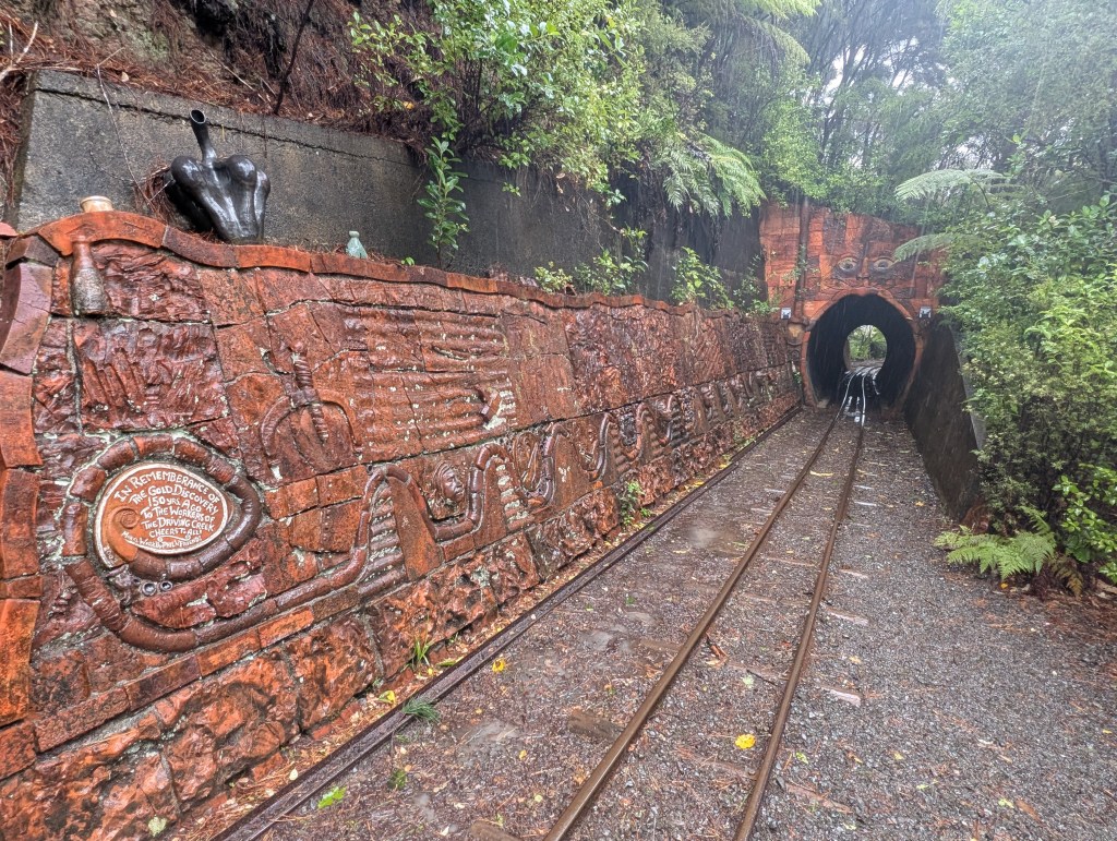 My afternoon stop was at Driving Creek Railway. I wasn’t sure how it would be to ride an open air railway car through the forest in the rain, but with the ponchos Driving Creek provided, I was able to dry enough to enjoy the ride and artwork along the way. As the narrow gauge railway traverses the switchbacks and squeezes through tunnels, artist Barry Brickell’s installations and sculptures pop out from the surrounding forest. Brickell first built this railway as a means to carry the mountain’s clay back to the workshop, but as more and more people asked for rides, he realized that this could also be a public attraction. We passed several viewpoints including the final one at the EyeFull tower, and I can imagine that on a clear day the vistas would’ve been impressive.