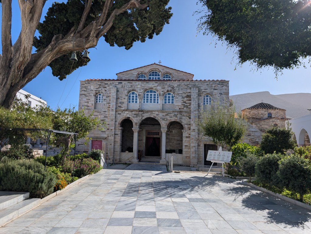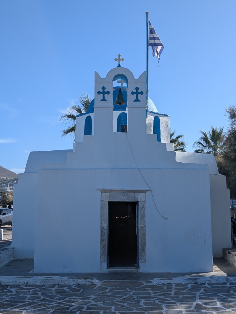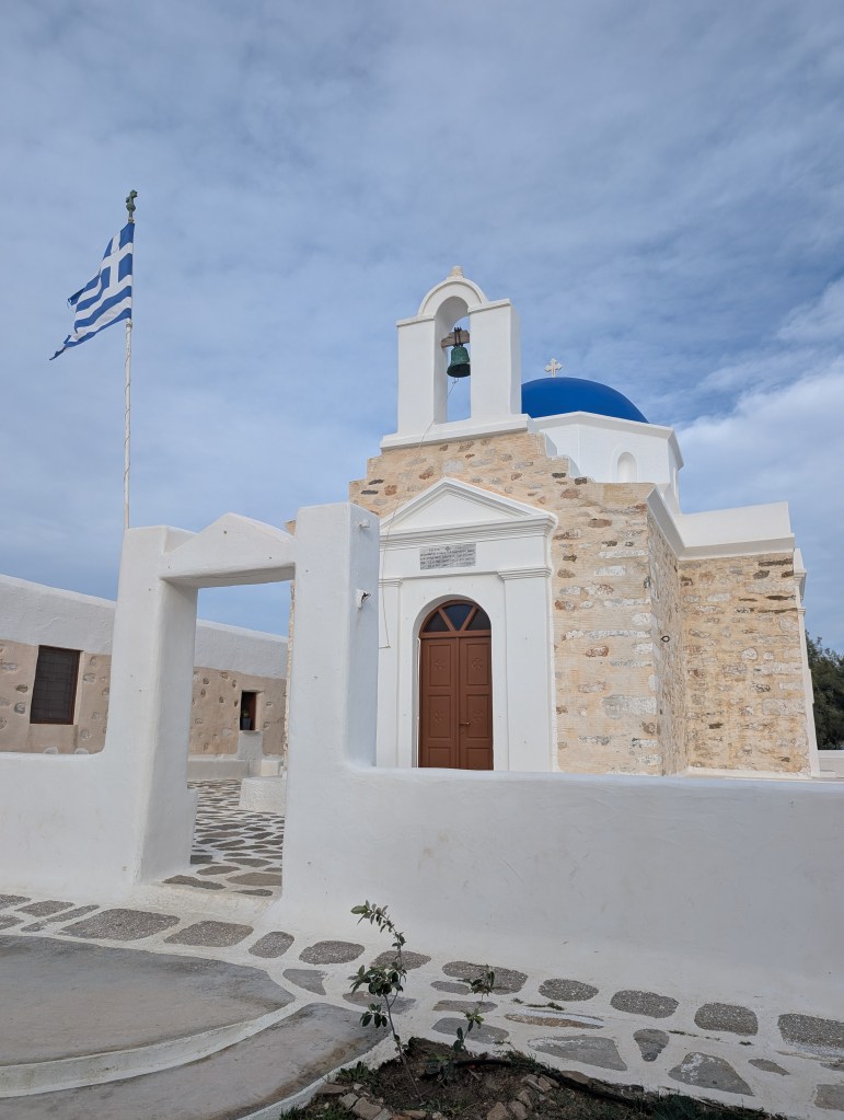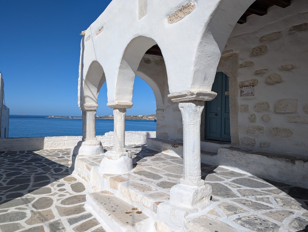 I started with a morning walk at Paros Park. The narrow path through the rocky coastline along the peninsula leads to a lighthouse. There is also a small harbor beach (Katholiko beach) where people were launching kayaks set below the blue domed St. John of Deti monastery.