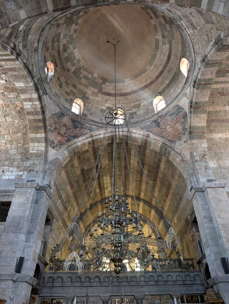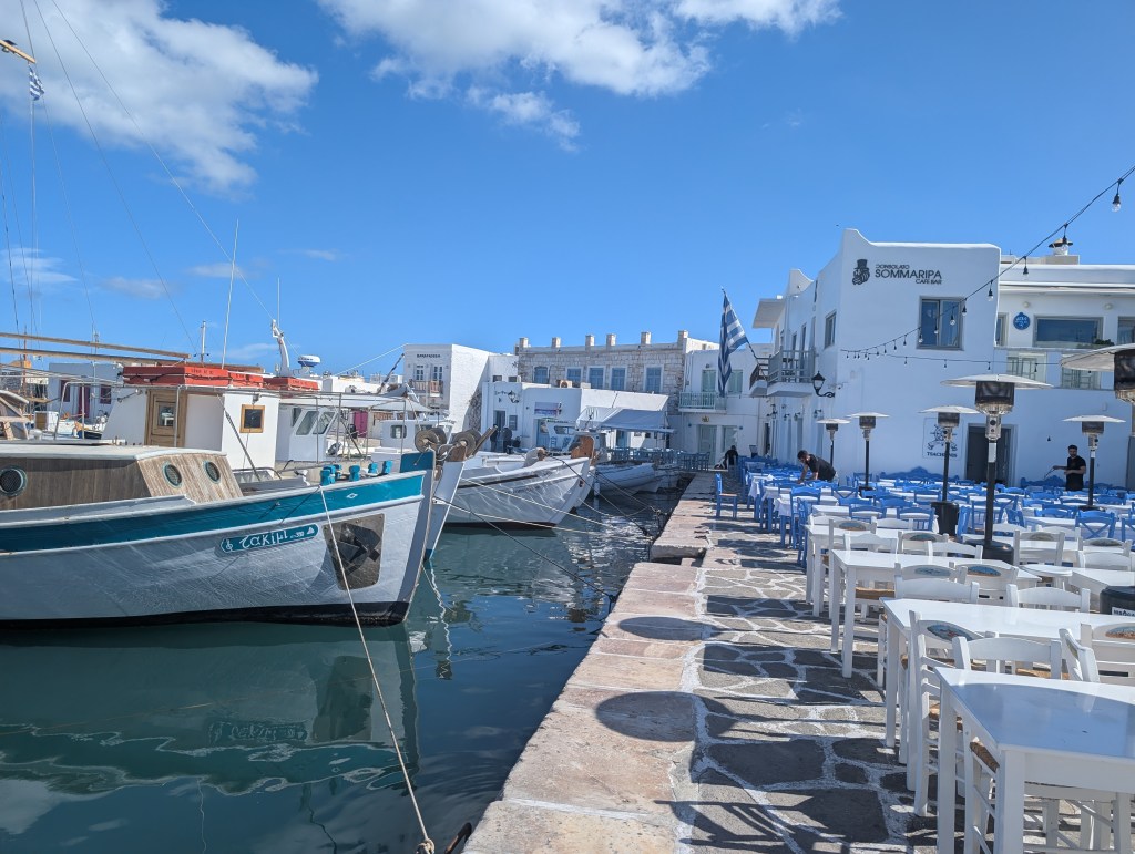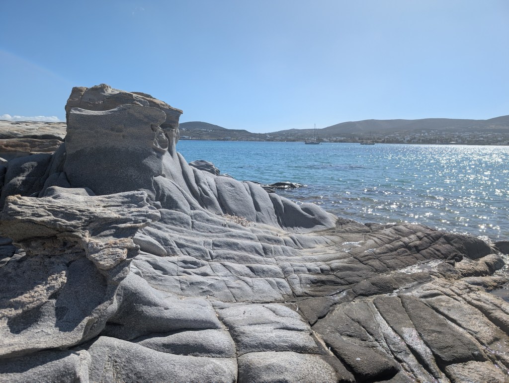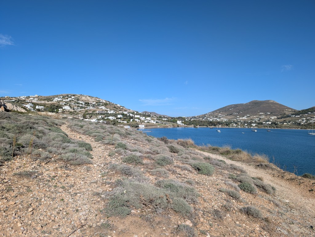 I started with a morning walk at Paros Park. The narrow path through the rocky coastline along the peninsula leads to a lighthouse. There is also a small harbor beach (Katholiko beach) where people were launching kayaks set below the blue domed St. John of Deti monastery.