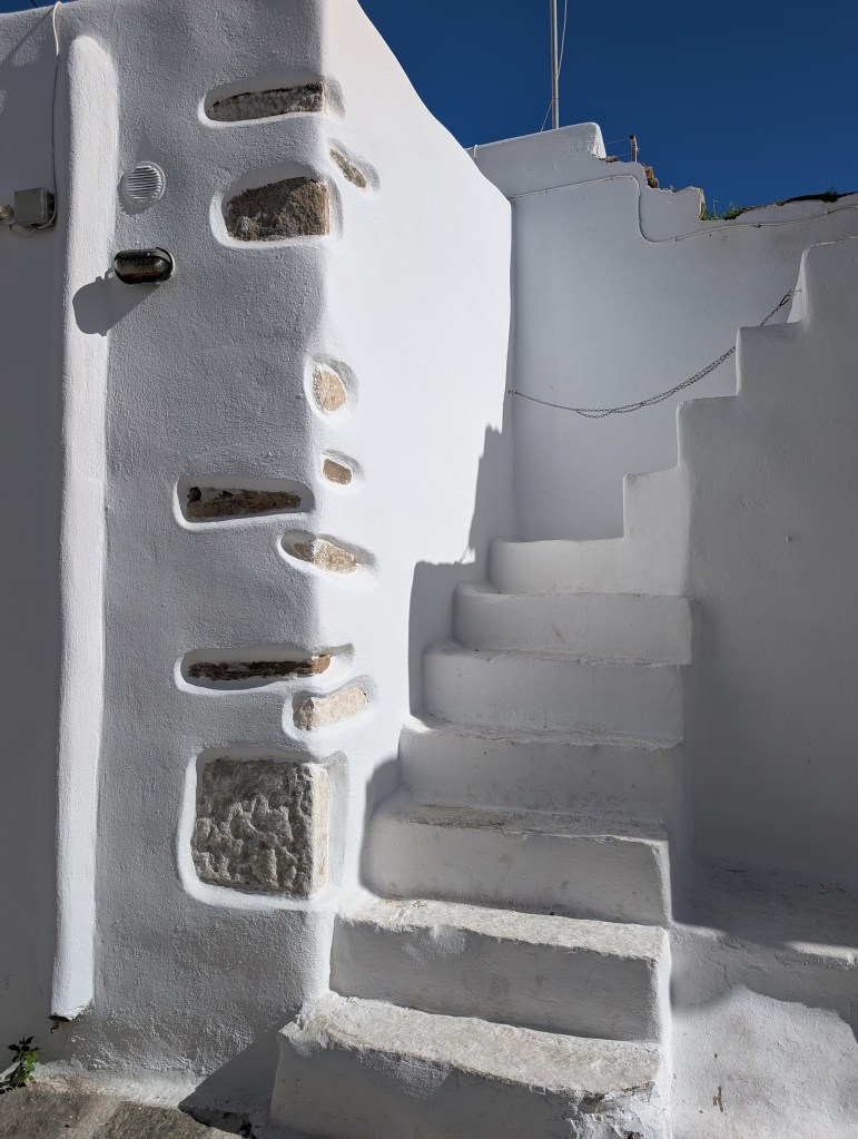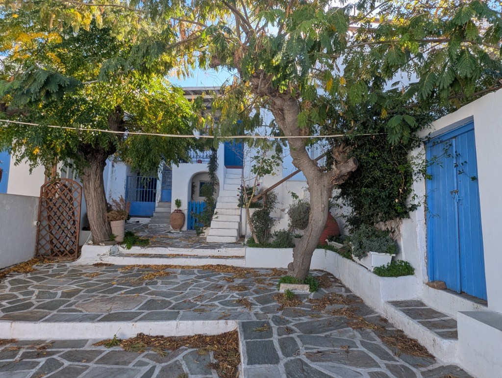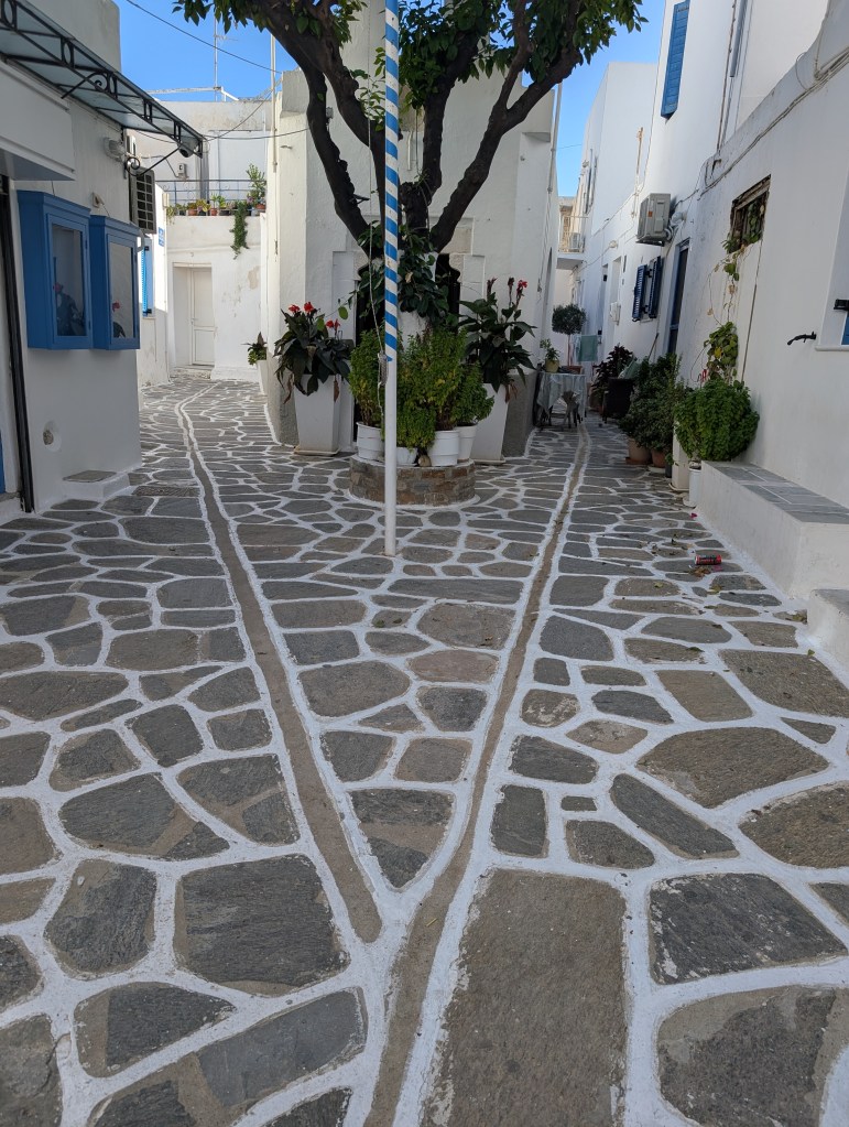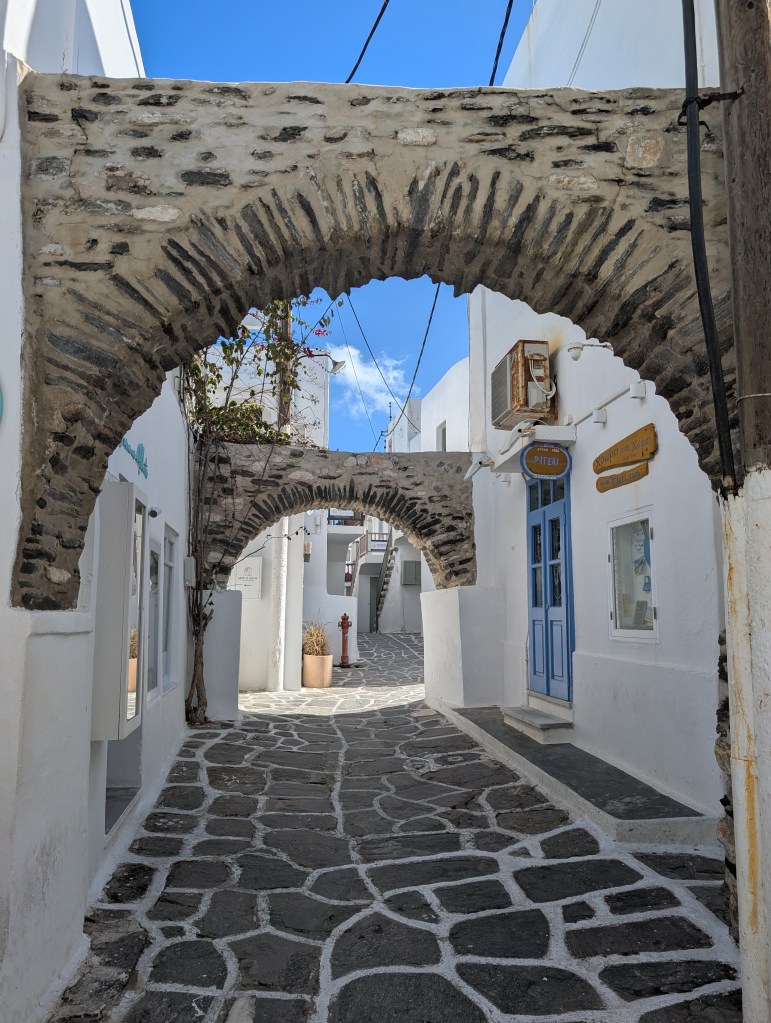 As one of the Cyclades islands, Paros is an easy 4 hour ferry ride from Piraeus port in Athens. Paroikia’s old town is just to the right of the ferry dock. I arrived late on a Friday night in October when the narrow cobbled paths through the old city were quiet and atmospheric. I was happy that Google Maps was able to navigate me through the maze of streets to my lodging.
