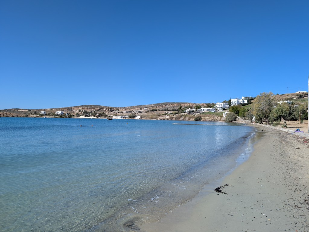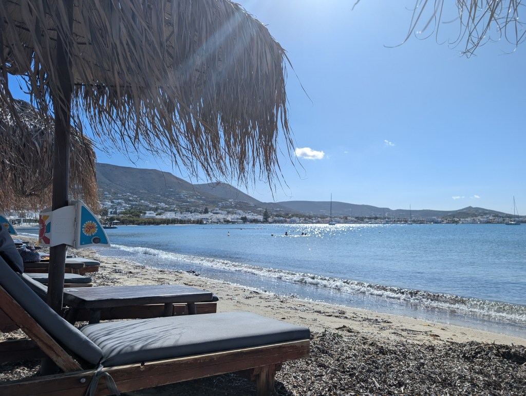 While there is a small beach in front of the old town, most people walk left past the ferry dock to the narrow Livadia Beach. However, with the road running right behind it, I decided to keep walking to the smaller Paralia Parikia. Here a few restaurants line the beach and offer sun loungers and umbrellas in exchange for spending a certain amount of money at the restaurant. Since I was there during the off season, it was easy to reserve one of these loungers for the afternoon, but I’m assuming it would be a lot busier during the high season.