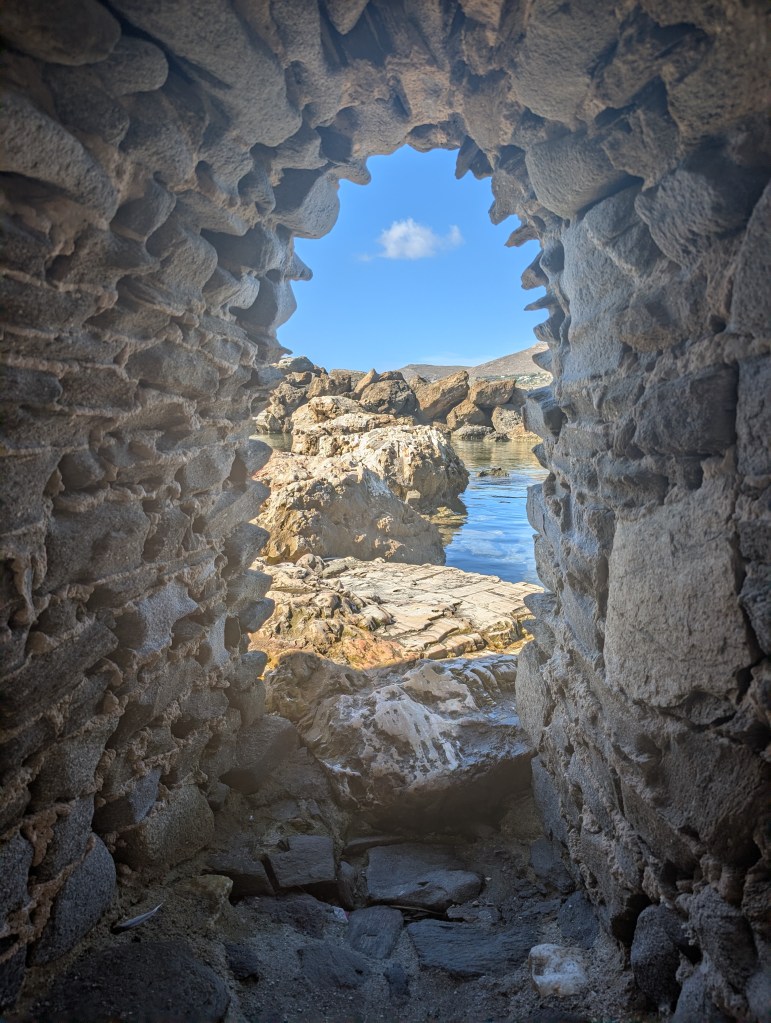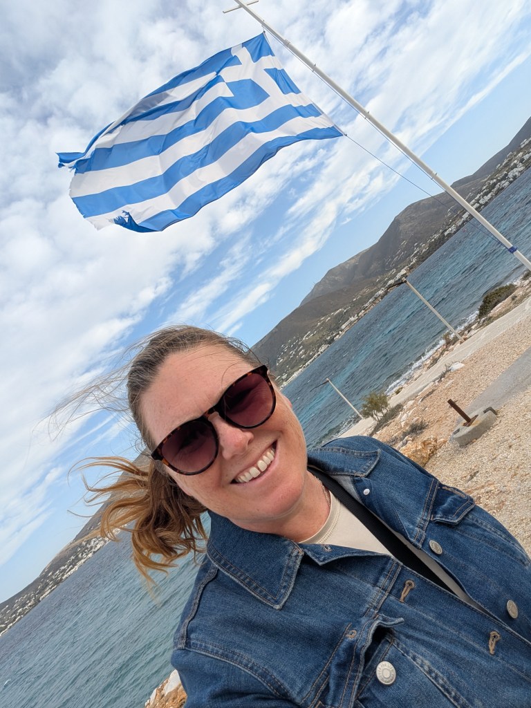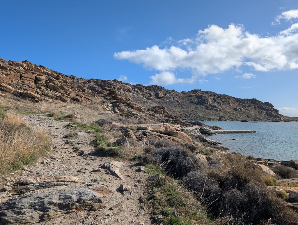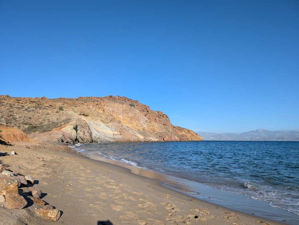 Now that it was afternoon, it was time to find a beach to swim in. On the eastern side of the island is the more remote Kalogeros beach. Known for its natural clay deposits, the beach becomes a personal spa day. I didn’t know until talking with someone at the beach that in order to make this happen, you have to bring your own water and forge for the clay off the cliffs behind the main beach. If I came back, I would be more prepared to fully enjoy the spa elements of the beach. While the water at the other beaches I had stopped at were sheltered and calm, this beach was more exposed to the vast ocean, thus windy with more surf, but that wasn’t going to stop me from taking a refreshing swim in the water.