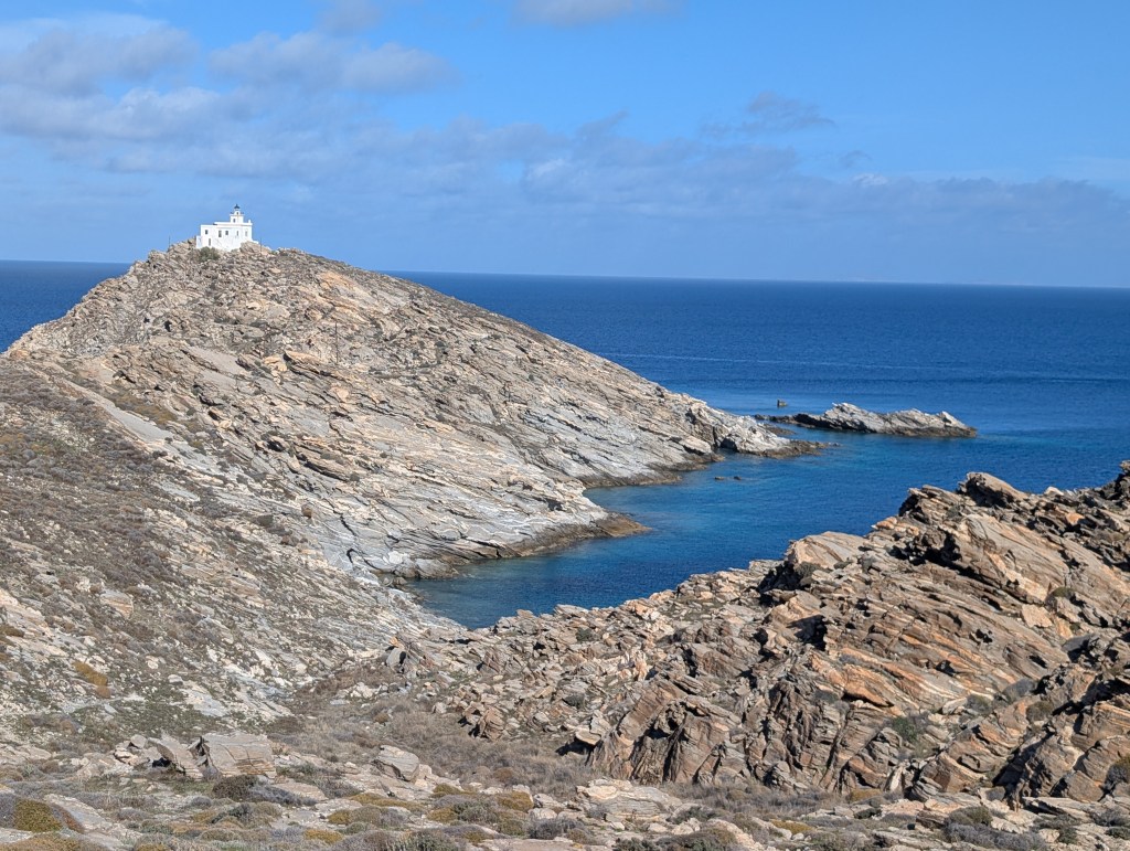 After enjoying the shallow and cool water and relaxing under the shade of the umbrella for some time, I decided to stretch my legs and walk along the coast to the the blue domed Church of Agios Fokas. While I lost the path and decided to turn back that day, I did drive to the lighthouse the next day to feel the wind and take in panoramic views of Pariokia’s harbor.