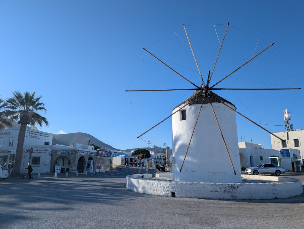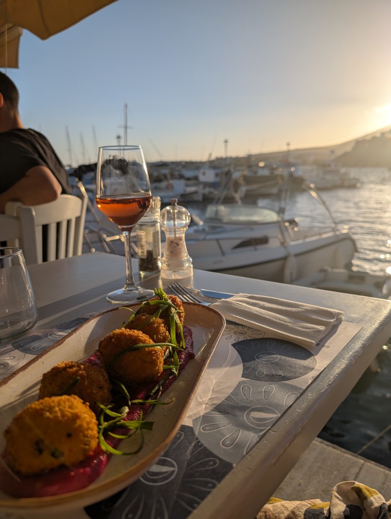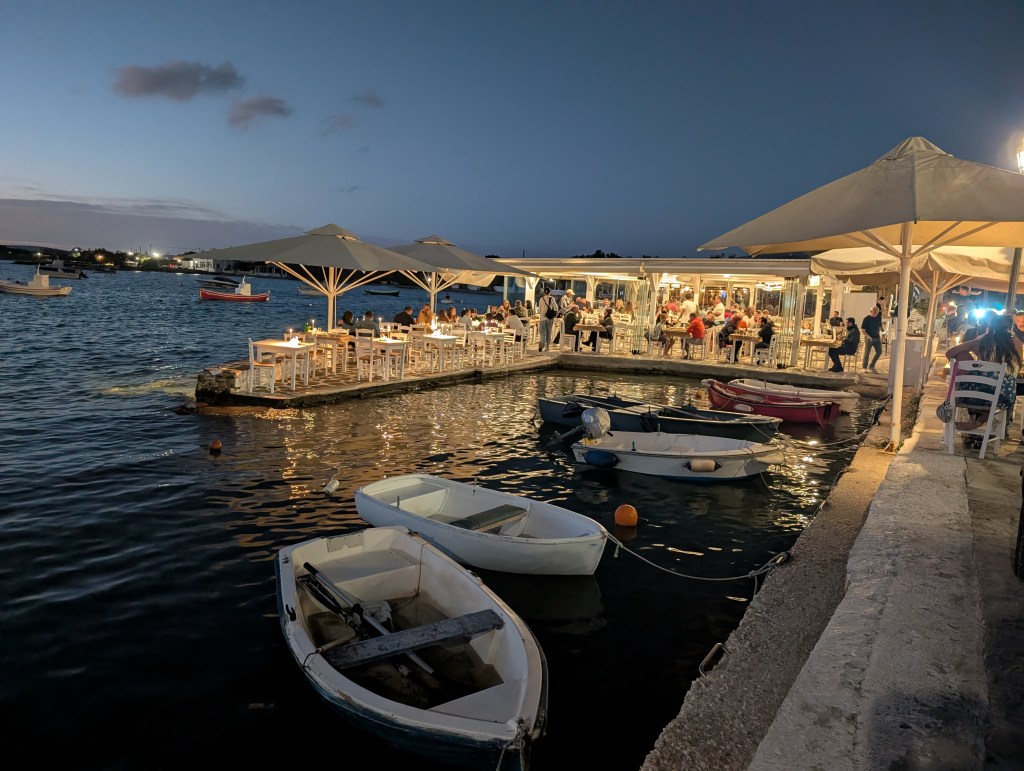 I ended the day with stops at two smaller fishing villages. The first was Piso Livadi. The east side fishing village consists of a handful of restaurants lining the jetty out to the point. I ordered a drink and appetizer and grabbed a harborside table to take in the sunset.