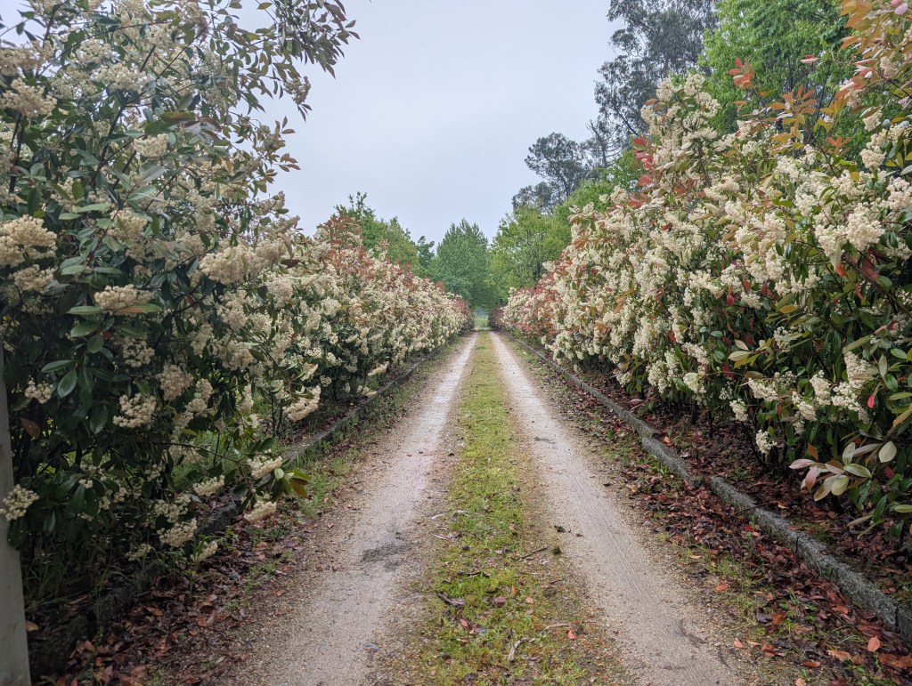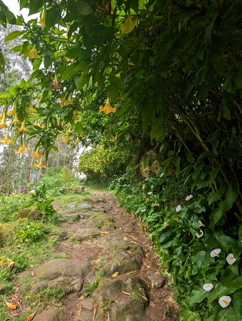 As worried as I was about having to spend the day talking, I was able to have a quick chat with one of the groups at the local cafe before continuing the journey solo. The morning drizzle soon abated leaving shiny leaves, running streams, and chirping birds. Framed by calla lilies and angel trumpets, spring surrounded me.