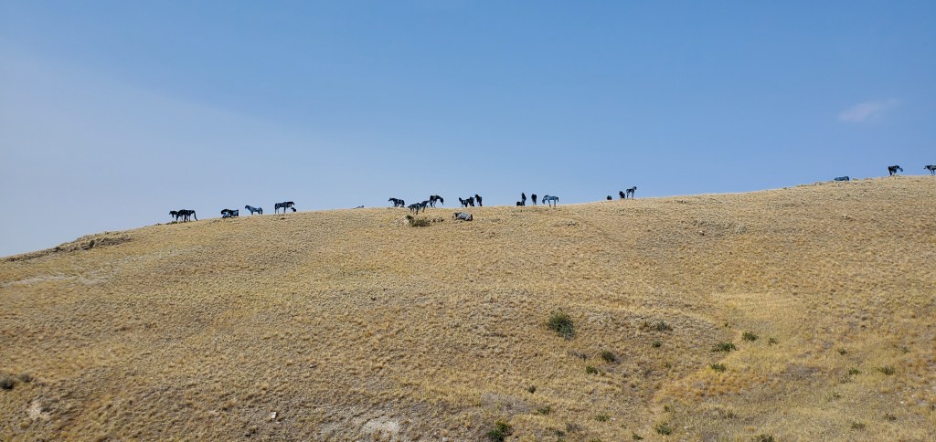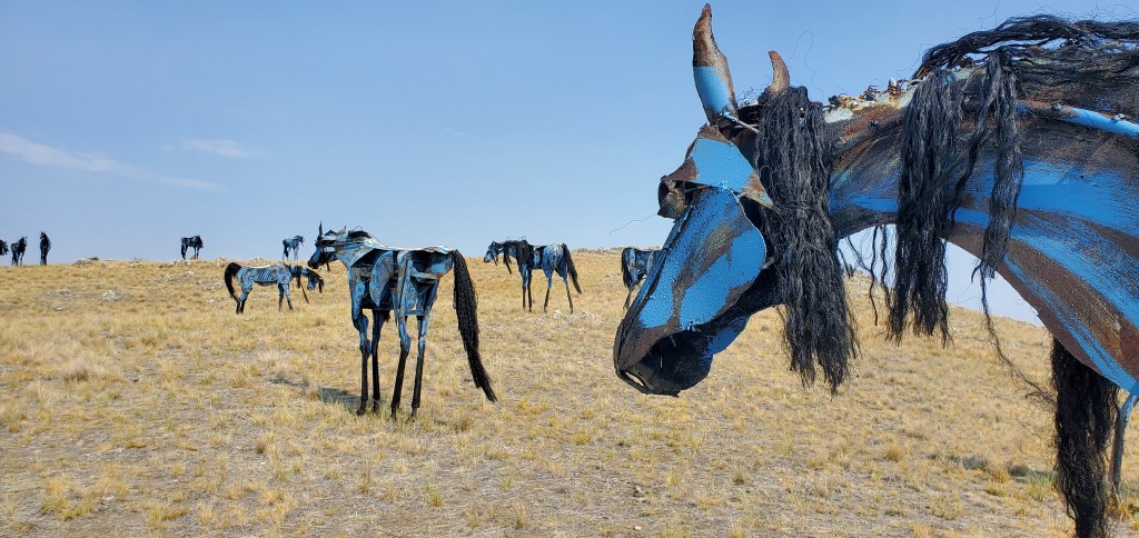 My first stop was a roadside attraction. Set along highway 287 in Three Forks, Montana are artist Jim Dolan’s Bleu Horses. From afar these 39 eight foot tall metal horses look like a real herd of wild horses; their posture, social interactions, and flowing manes illustrate Dolan’s understanding of horses. While they were visible from the street, I made my way up to the top of the hill to see the unique features of each horse close up.